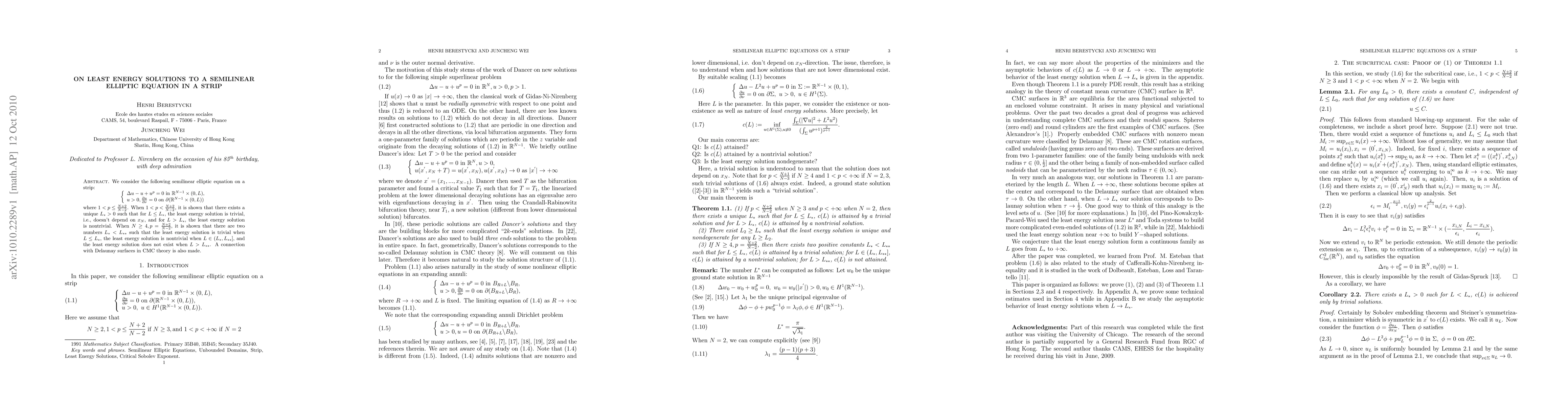 We consider the following semilinear elliptic equation on a strip: \[ \left\{{array}{l} \Delta u-u + u^p=0 \ {in} \ \R^{N-1} \times (0, L), u>0, \frac{\partial u}{\partial \nu}=0 \ {on} \ \partial (\R^{N-1} \times (0, L)) {array} \right.\] where $ 1< p\leq \frac{N+2}{N-2}$. When $ 1