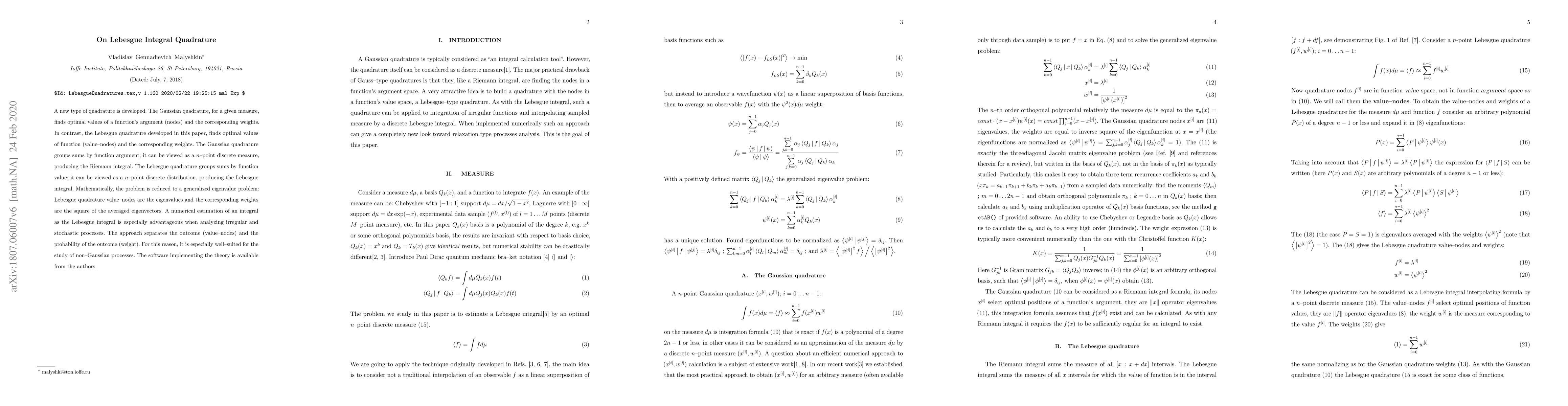 A new type of quadrature is developed. The Gaussian quadrature, for a given measure, finds optimal values of a function's argument (nodes) and the corresponding weights. In contrast, the Lebesgue quadrature developed in this paper, finds optimal values of function (value-nodes) and the corresponding weights. The Gaussian quadrature groups sums by function argument; it can be viewed as a $n$-point discrete measure, producing the Riemann integral. The Lebesgue quadrature groups sums by function value; it can be viewed as a $n$-point discrete distribution, producing the Lebesgue integral. Mathematically, the problem is reduced to a generalized eigenvalue problem: Lebesgue quadrature value-nodes are the eigenvalues and the corresponding weights are the square of the averaged eigenvectors. A numerical estimation of an integral as the Lebesgue integral is especially advantageous when analyzing irregular and stochastic processes. The approach separates the outcome (value-nodes) and the probability of the outcome (weight). For this reason, it is especially well-suited for the study of non-Gaussian processes. The software implementing the theory is available from the authors.