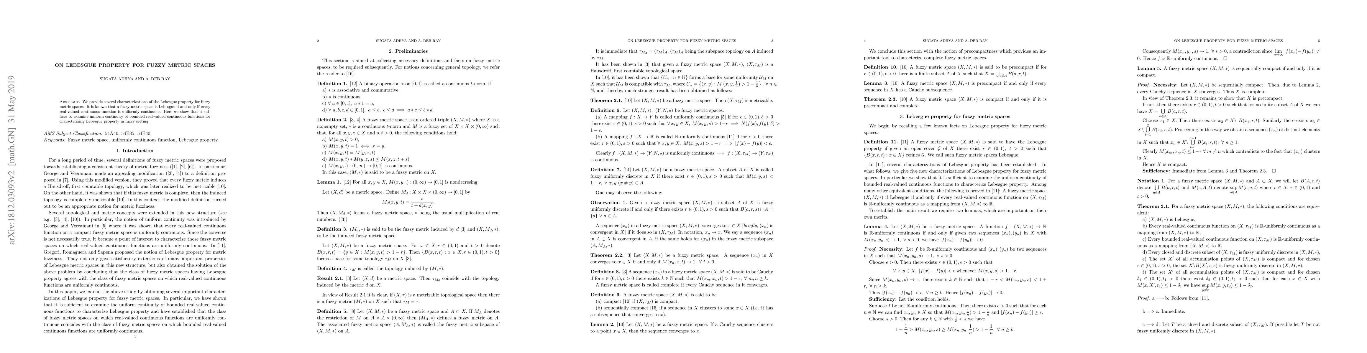 Summary: This paper characterizes the Lebesgue property in fuzzy metric spaces, demonstrating that uniform continuity of bounded real-valued continuous functions is sufficient for this property. It confirms that a fuzzy metric space has the Lebesgue property if every such function is uniformly continuous.