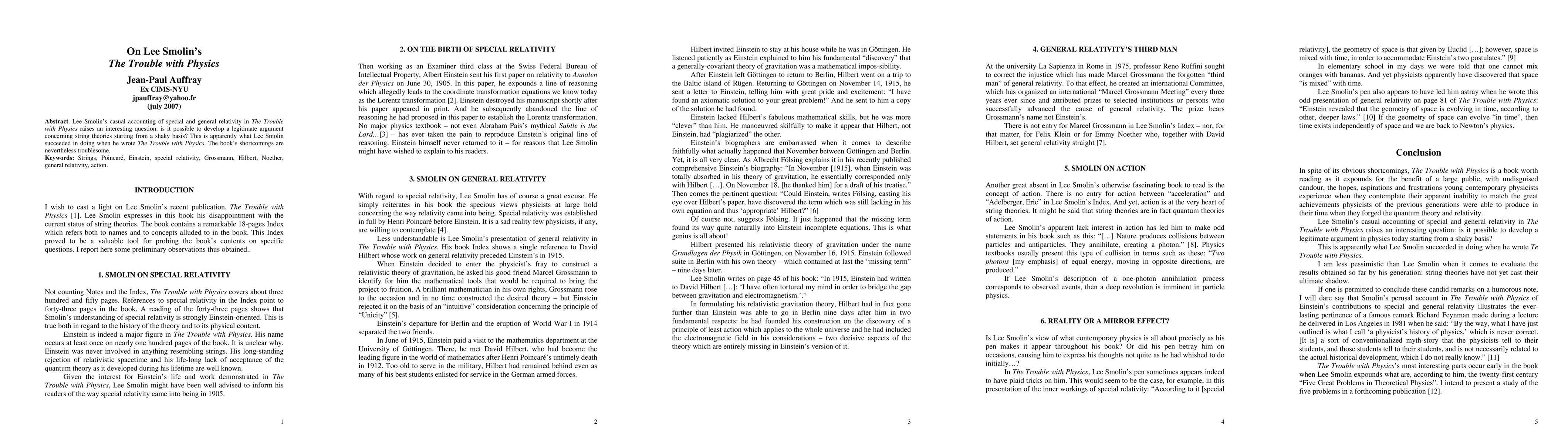Lee Smolin's casual accounting of special and general relativity in The Trouble with Physics raises an interesting question: is it possible to develop a legitimate argument concerning string theories starting from a shaky basis? This is apparently what Lee Smolin succeeded in doing when he wrote The Trouble with Physics. The book's shortcomings are nevertheless troublesome.