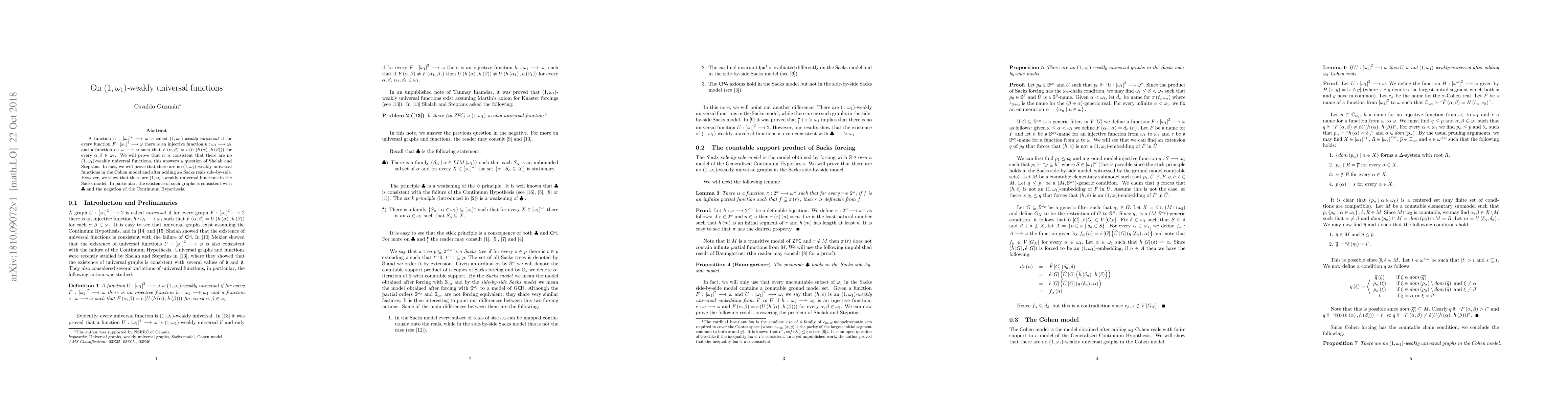 A function $U:\left[ \omega_{1}\right] ^{2}\longrightarrow\omega$ is called $\left( 1,\omega_{1}\right) $\emph{-weakly universal }if for every function $F:\left[ \omega_{1}\right] ^{2}\longrightarrow\omega$ there is an injective function $h:\omega_{1}\longrightarrow\omega_{1}$ and a function $e:\omega \longrightarrow\omega$ such that $F\left( \alpha,\beta\right) =e\left( U\left( h\left( \alpha\right) ,h\left( \beta\right) \right) \right) $ for every $\alpha,\beta\in\omega_{1}$. We will prove that it is consistent that there are no $\left( 1,\omega_{1}\right) $\emph{-}weakly universal functions, this answers a question of Shelah and Stepr\={a}ns. In fact, we will prove that there are no $\left( 1,\omega_{1}\right) $\emph{-}weakly universal functions in the Cohen model and after adding $\omega_{2}$ Sacks reals side-by-side. However, we show that there are $\left( 1,\omega _{1}\right) $\emph{-}weakly universal functions in the Sacks model. In particular, the existence of such graphs is consistent with $\clubsuit$ and the negation of the Continuum Hypothesis.