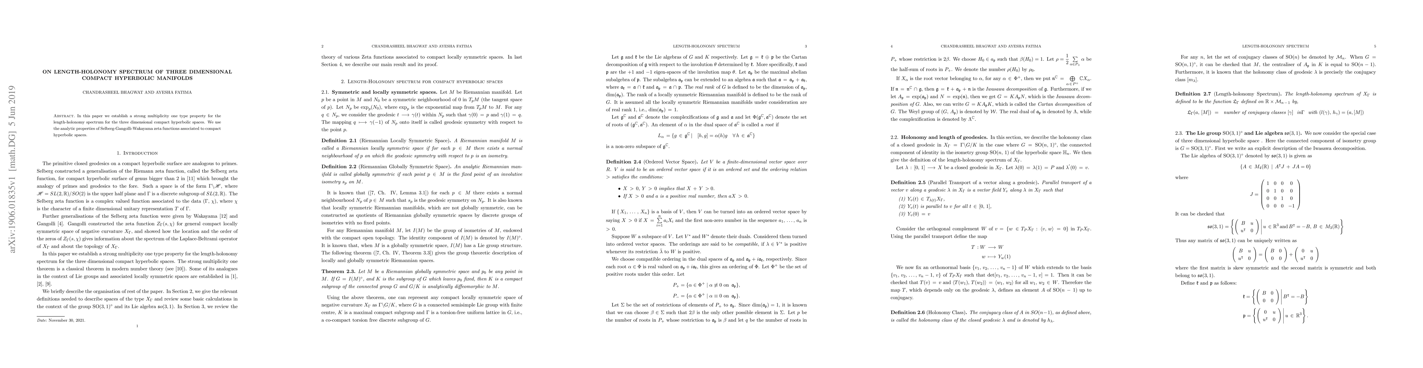 Summary: The paper proves a strong multiplicity one property for the length-holonomy spectrum in three-dimensional compact hyperbolic manifolds using the analytic properties of Selberg-Gangolli-Wakayama zeta functions. This result enhances our understanding of the spectrum's structure in hyperbolic spaces.