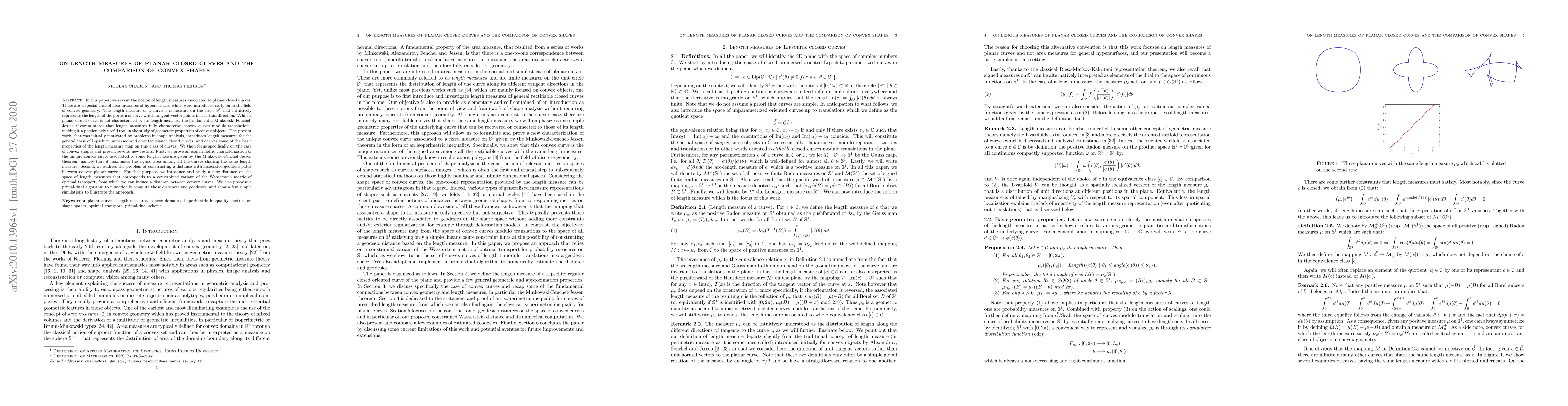 In this paper, we revisit the notion of length measures associated to planar closed curves. These are a special case of area measures of hypersurfaces which were introduced early on in the field of convex geometry. The length measure of a curve is a measure on the circle $\mathbb{S}^1$ that intuitively represents the length of the portion of curve which tangent vector points in a certain direction. While a planar closed curve is not characterized by its length measure, the fundamental Minkowski-Fenchel-Jessen theorem states that length measures fully characterize convex curves modulo translations, making it a particularly useful tool in the study of geometric properties of convex objects. The present work, that was initially motivated by problems in shape analysis, introduces length measures for the general class of Lipschitz immersed and oriented planar closed curves, and derives some of the basic properties of the length measure map on this class of curves. We then focus specifically on the case of convex shapes and present several new results. First, we prove an isoperimetric characterization of the unique convex curve associated to some length measure given by the Minkowski-Fenchel-Jessen theorem, namely that it maximizes the signed area among all the curves sharing the same length measure. Second, we address the problem of constructing a distance with associated geodesic paths between convex planar curves. For that purpose, we introduce and study a new distance on the space of length measures that corresponds to a constrained variant of the Wasserstein metric of optimal transport, from which we can induce a distance between convex curves. We also propose a primal-dual algorithm to numerically compute those distances and geodesics, and show a few simple simulations to illustrate the approach.