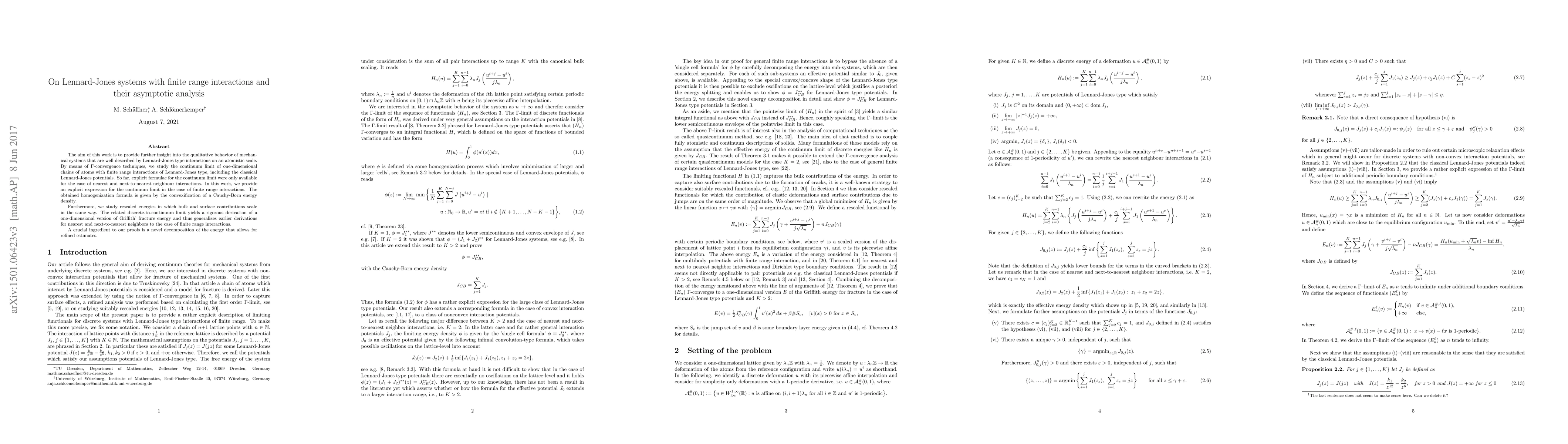 This paper investigates the continuum limit of Lennard-Jones systems using $\Gamma$-convergence techniques, providing an explicit formula for the homogenization of finite range interactions. It also rigorously derives a one-dimensional Griffith fracture energy, extending previous results to systems beyond nearest and next-to-nearest neighbor interactions.