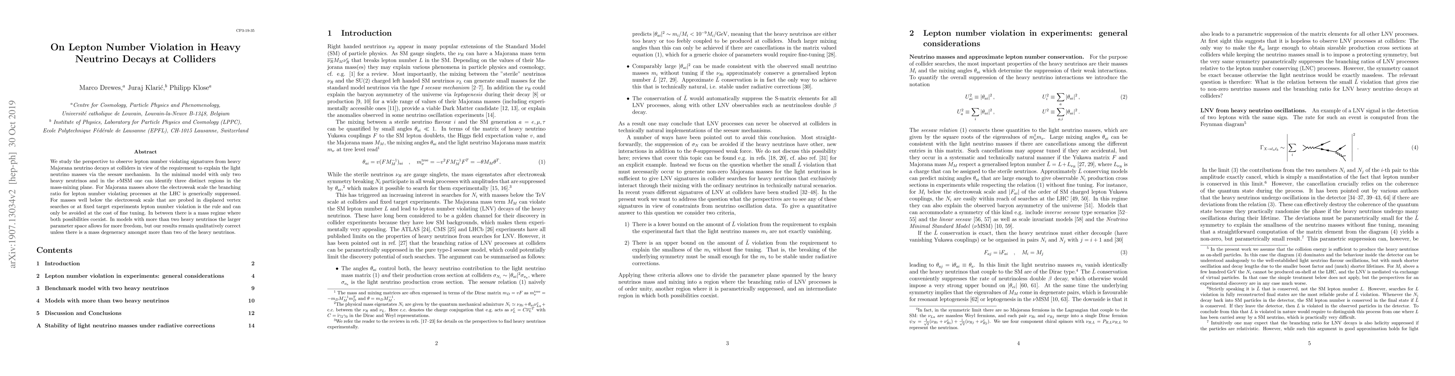 This paper investigates the potential for observing lepton number violation in heavy Majorana neutrino decays at colliders, focusing on the seesaw mechanism for explaining light neutrino masses. It identifies three distinct regions in the mass-mixing plane, with lepton number violation being suppressed for high Majorana masses and prevalent for low masses, while an intermediate regime allows for both possibilities.