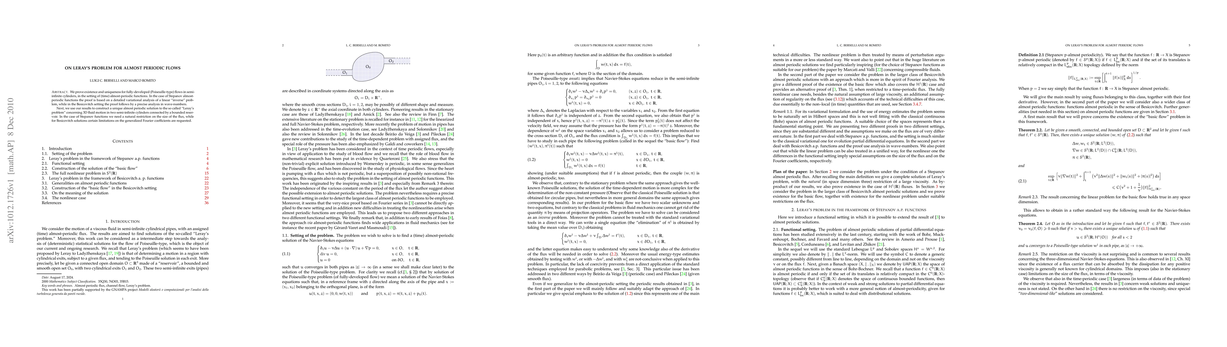 Researchers proved existence and uniqueness of fully-developed flows in semi-infinite cylinders for almost-periodic functions, leading to a unique solution to Leray's problem for 3D fluid motion in two connected cylinders.
