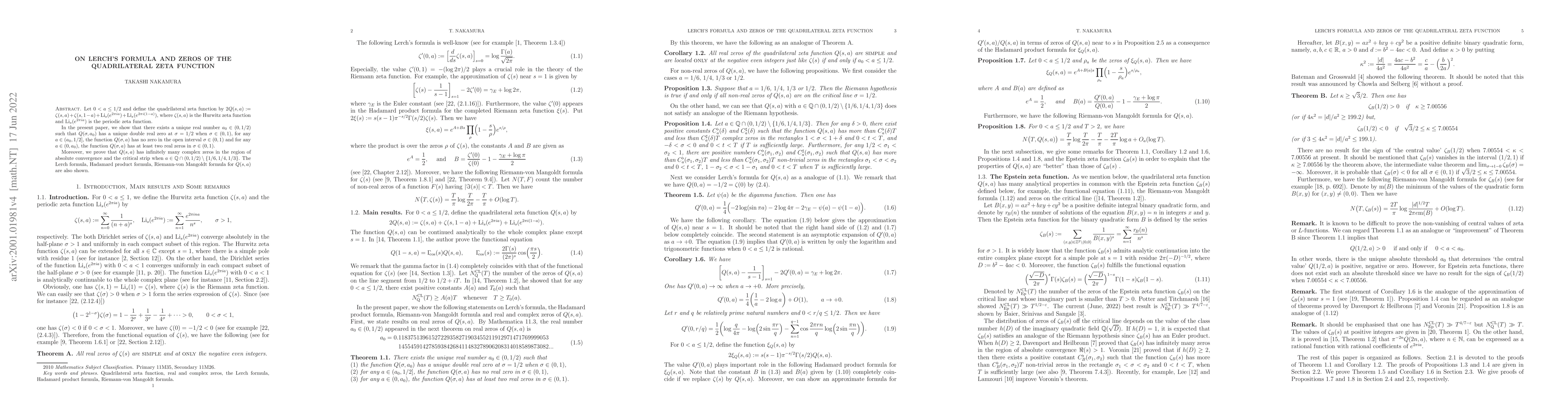 This paper investigates the zeros of the quadrilateral zeta function $Q(s,a)$, revealing a unique real number $a_0$ such that $Q(σ, a_0)$ has a double zero at $σ = 1/2$ while $Q(σ, a)$ has no zeros in $(0,1)$ for $a > a_0$ and at least two zeros for $a < a_0$. It also proves the function has infinitely many complex zeros and presents related formulas including the Lerch formula.