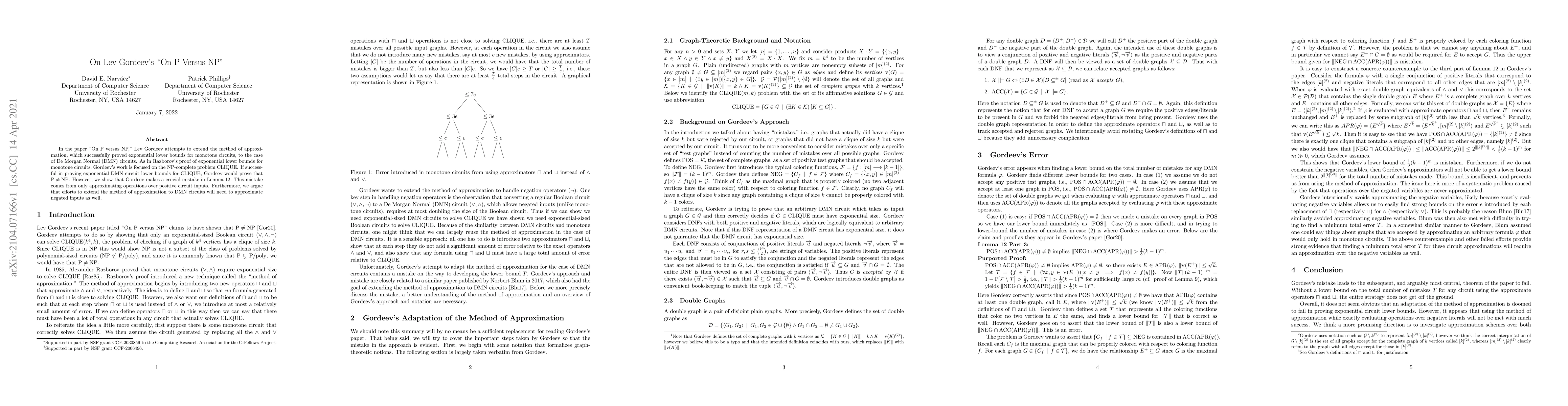 In the paper "On P versus NP," Lev Gordeev attempts to extend the method of approximation, which successfully proved exponential lower bounds for monotone circuits, to the case of De Morgan Normal (DMN) circuits. As in Razborov's proof of exponential lower bounds for monotone circuits, Gordeev's work is focused on the NP-complete problem CLIQUE. If successful in proving exponential DMN circuit lower bounds for CLIQUE, Gordeev would prove that P $\neq$ NP. However, we show that Gordeev makes a crucial mistake in Lemma 12. This mistake comes from only approximating operations over positive circuit inputs. Furthermore, we argue that efforts to extend the method of approximation to DMN circuits will need to approximate negated inputs as well.
