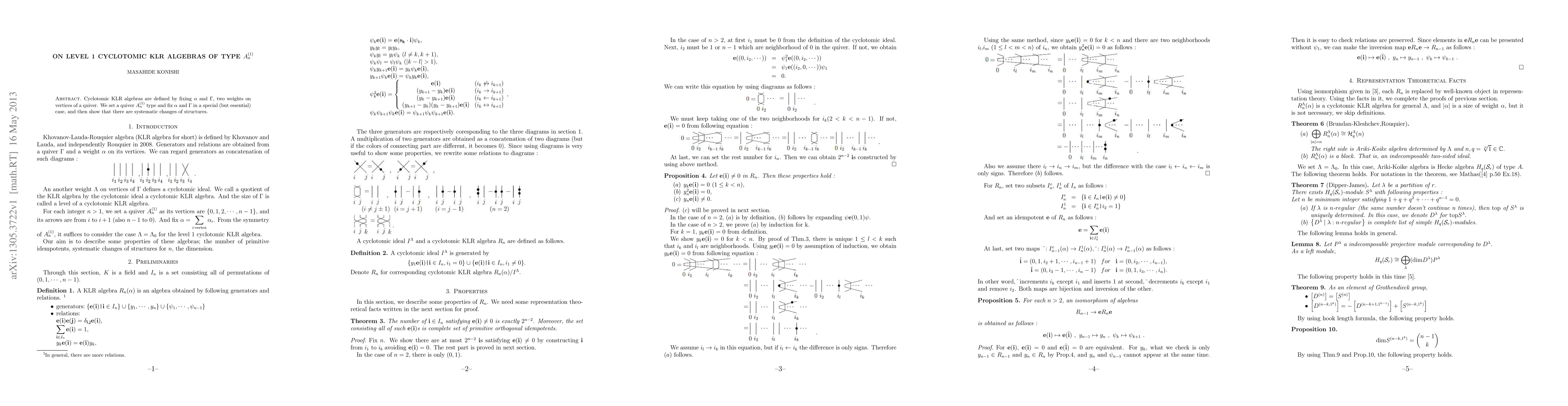 Summary: This paper explores the properties of level 1 cyclotomic KLR algebras of type $A_{n}^{(1)}$, focusing on the number of primitive idempotents, systematic structural changes, and the dimension of these algebras.
