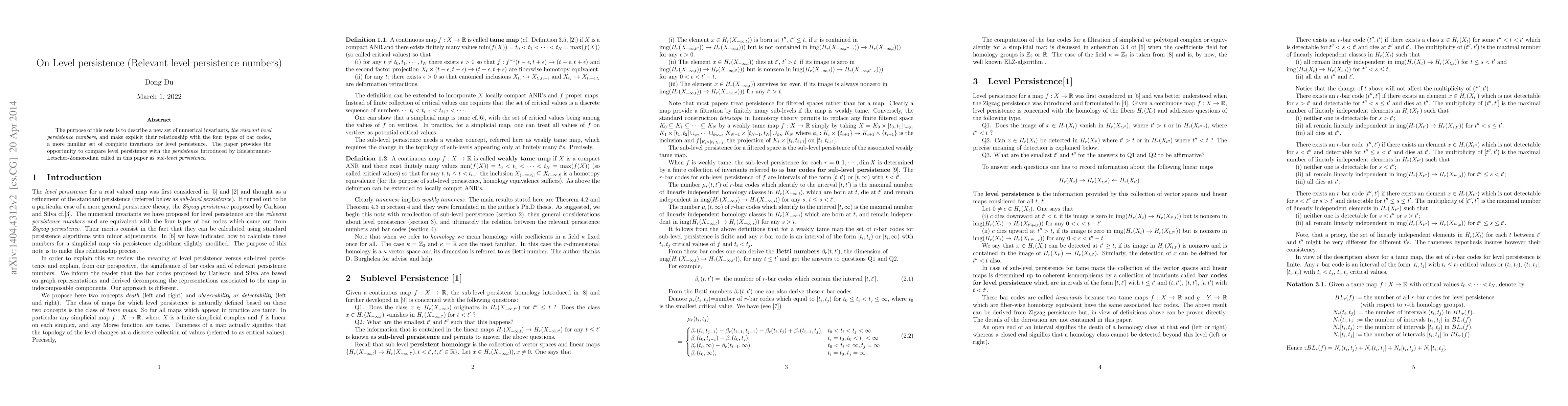 The purpose of this note is to describe of a new set of numerical invariants, the relevant level persistence numbers, and make explicit their relationship with the four types of bar codes, a more familiar set of complete invariants for level persistence. The paper provides the opportunity to compare level persistence with the persistence introduced by Edelsbrunner- Letscher-Zomorodian called in this paper, as sub-level persistence.