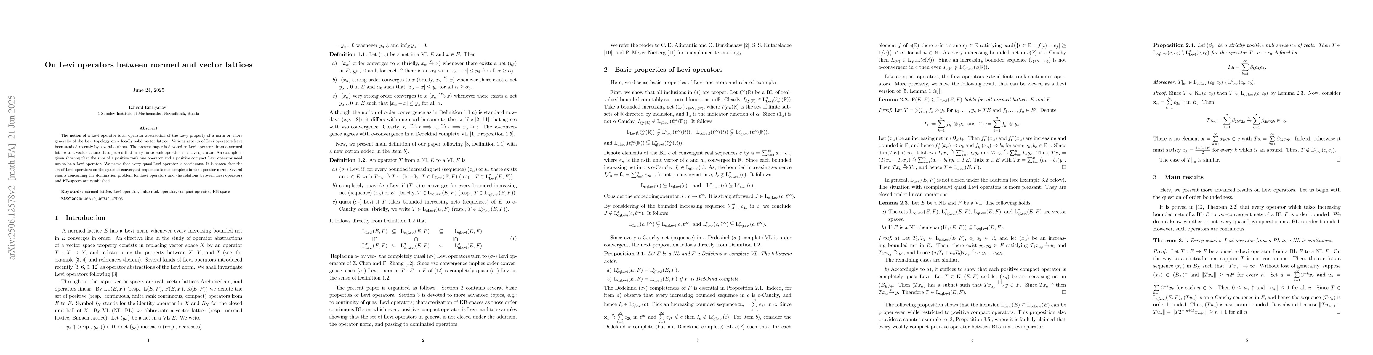 The notion of a Levi operator is an operator abstraction of the Levy property of a norm or, more generally of the Levi topology on a locally solid vector lattice. Various aspects of Levi operators have been studied recently by several authors. The present paper is devoted to Levi operators from a normed lattice to a vector lattice. It is proved that every finite rank operator is a Levi operator. An example is given showing that the sum of a positive rank one operator and a positive compact Levi operator need not to be a Levi operator. We prove that every quasi Levi operator is continuous. It is shown that the set of Levi operators on the space of convergent sequences is not complete in the operator norm. Several results concerning the domination problem for Levi operators and the relations between Levi operators and KB-spaces are established.