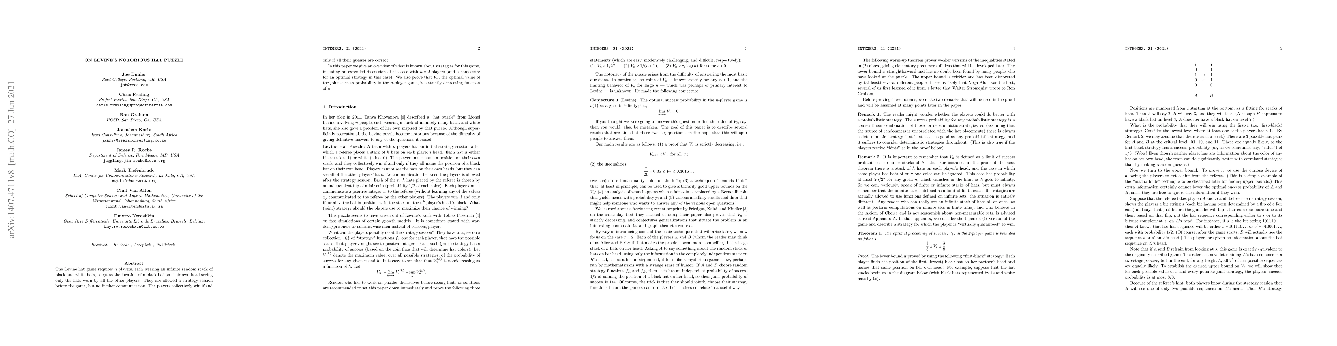 This paper explores strategies for the Levine hat game, a guessing game where n players try to figure out the location of a black hat on their own head without communication, and finds that the joint success probability decreases with increasing n.
