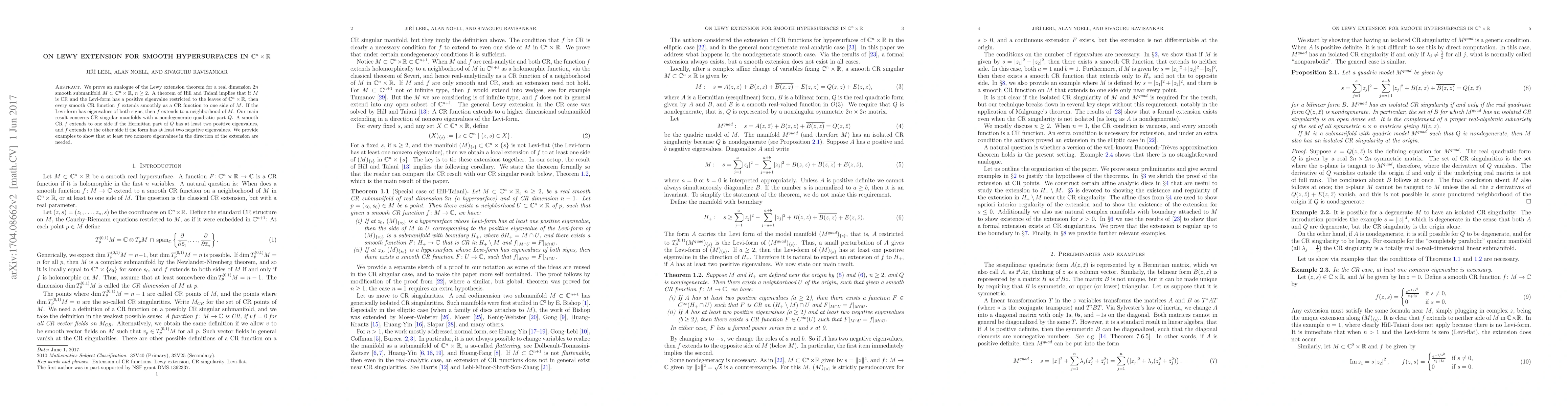 This paper proves an analogue of the Lewy extension theorem for smooth hypersurfaces in ${\mathbb C}^n \times {\mathbb R}$, showing that a smooth CR function extends smoothly if the Levi-form's Hermitian part has at least two positive or negative eigenvalues, respectively, in the direction of extension. Examples illustrate the necessity of having at least two nonzero eigenvalues for extension.