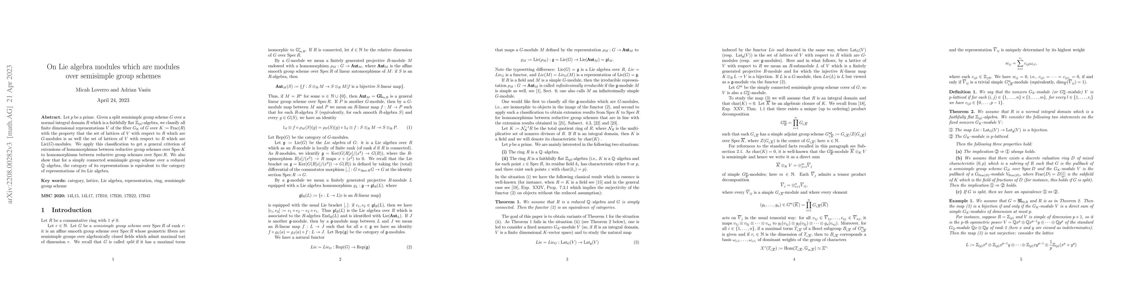 Let $p$ be a prime. Given a split semisimple group scheme $G$ over a normal integral domain $R$ which is a faithfully flat $\mathbb Z_{(p)}$-algebra, we classify all finite dimensional representations $V$ of the fiber $G_K$ of $G$ over $K:=\text{Frac}(R)$ with the property that the set of lattices of $V$ with respect to $R$ which are $G$-modules is as well the set of lattices of $V$ with respect to $R$ which are $\text{Lie}(G)$-modules. We apply this classification to get a general criterion of extensions of homomorphisms between reductive group schemes over $\text{Spec} K$ to homomorphisms between reductive group schemes over $\text{Spec} R$. We also show that for a simply connected semisimple group scheme over a reduced $\mathbb Q$--algebra, the category of its representations is equivalent to the category of representations of its Lie algebra.