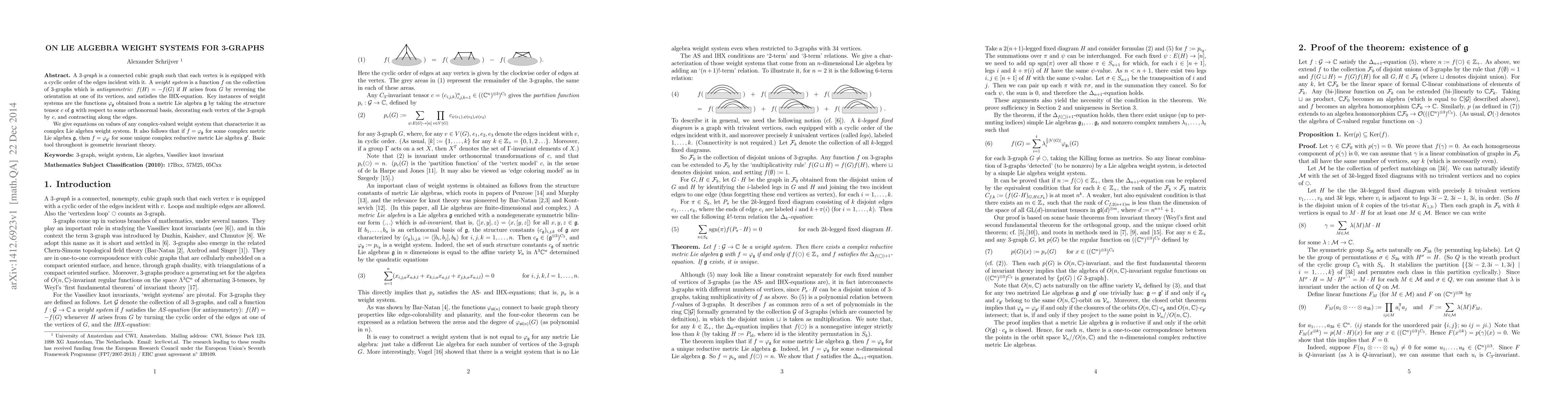 A {\em $3$-graph} is a connected cubic graph such that each vertex is is equipped with a cyclic order of the edges incident with it. A {\em weight system} is a function $f$ on the collection of $3$-graphs which is {\em antisymmetric}: $f(H)=-f(G)$ if $H$ arises from $G$ by reversing the orientation at one of its vertices, and satisfies the IHX-equation. Key instances of weight systems are the functions $\varphi_{\frak{g}}$ obtained from a metric Lie algebra $\frak{g}$ by taking the structure tensor $c$ of $\frak{g}$ with respect to some orthonormal basis, decorating each vertex of the $3$-graph by $c$, and contracting along the edges. We give equations on values of any complex-valued weight system that characterize it as complex Lie algebra weight system. It also follows that if $f=\varphi_{\frak{g}}$ for some complex metric Lie algebra $\frak{g}$, then $f=\varphi_{\frak{g}'}$ for some unique complex reductive metric Lie algebra $\frak{g}'$. Basic tool throughout is geometric invariant theory.