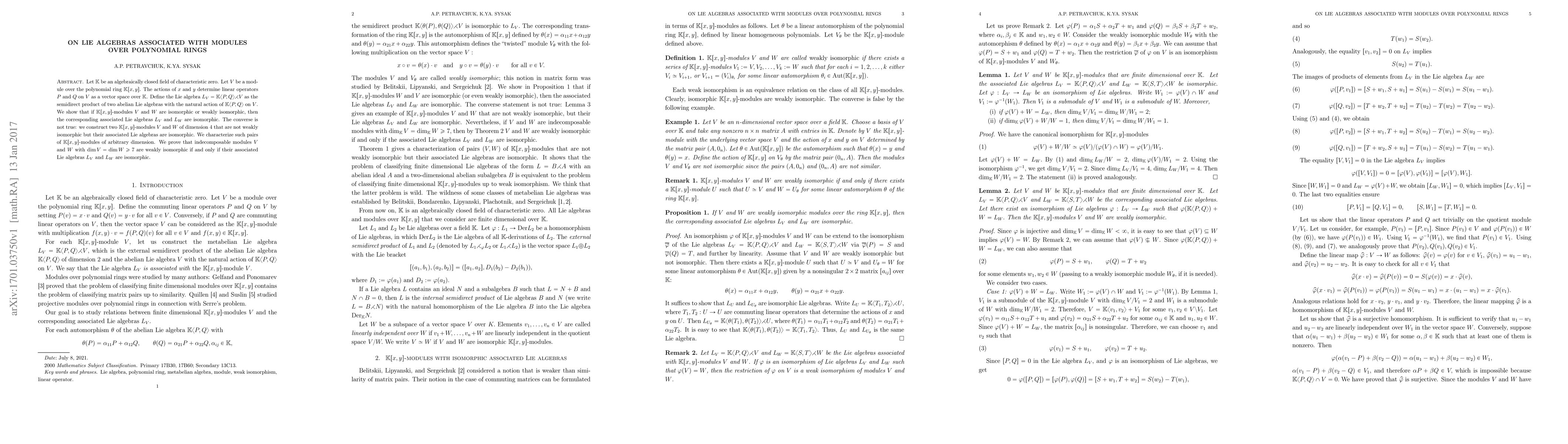 This paper investigates Lie algebras associated with modules over polynomial rings, demonstrating that isomorphic or weakly isomorphic modules yield isomorphic associated Lie algebras. It also presents a counterexample where non-weakly isomorphic modules share isomorphic associated Lie algebras and provides a characterization of such module pairs. Finally, it concludes that indecomposable modules of dimension at least 7 are weakly isomorphic if their associated Lie algebras are isomorphic.