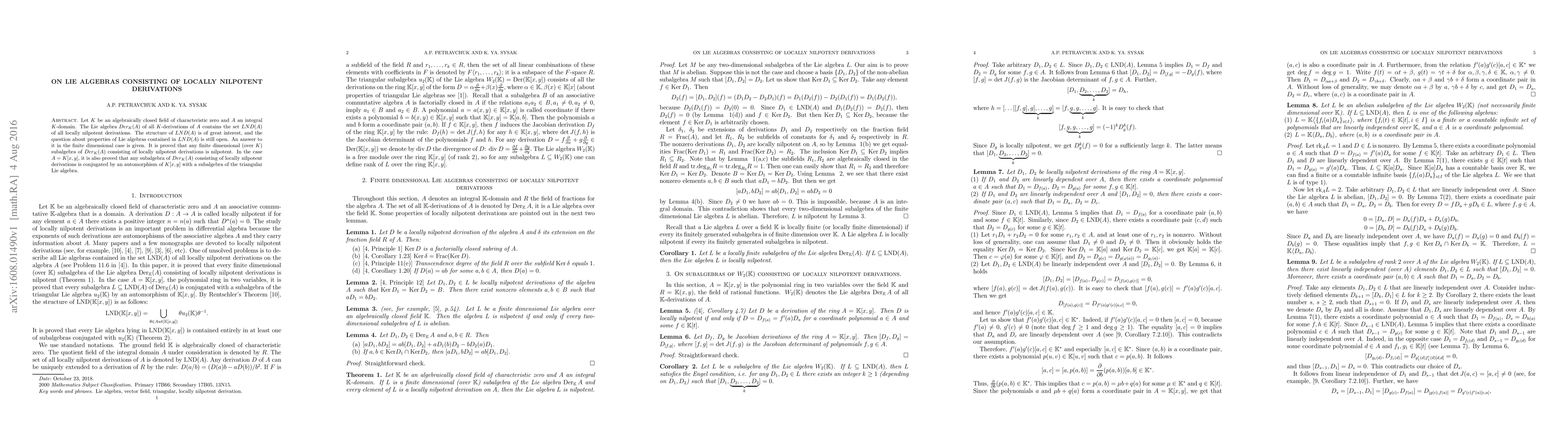 This paper investigates the structure of Lie algebras formed by locally nilpotent derivations in the context of an integral domain over an algebraically closed field of characteristic zero. It proves that any finite-dimensional subalgebra of locally nilpotent derivations within the Lie algebra of $K$-derivations is nilpotent and, specifically for $A=K[x, y]$, such subalgebras can be conjugated to subalgebras of a triangular Lie algebra.