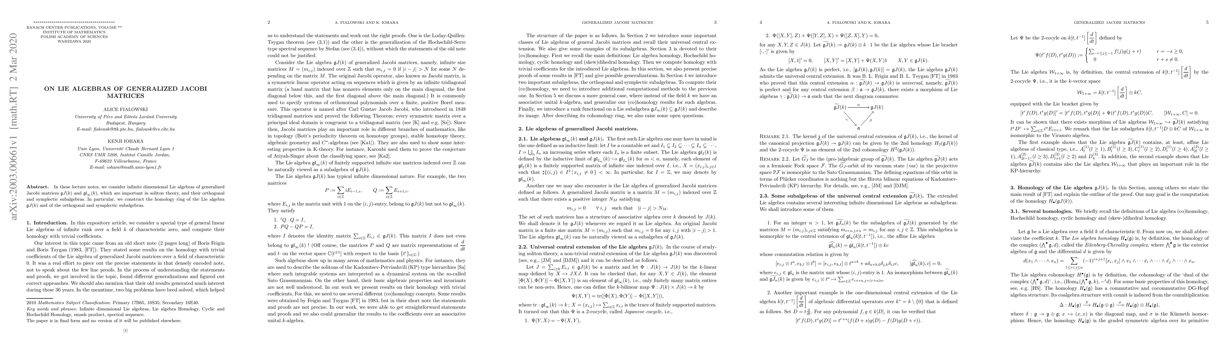 In this lecutre note, we consider infinite dimensional Lie algebras of generalized Jacobi matrices $\mathfrak{g}J(k)$ and $\mathfrak{gl}_\infty(k)$, which are important in soliton theory, and their orthogonal and symplectic subalgebras. In particular, we construct the homology ring of the Lie algebra $\mathfrak{g}J(k)$ and of the orthogonal and symplectic subalgebras.