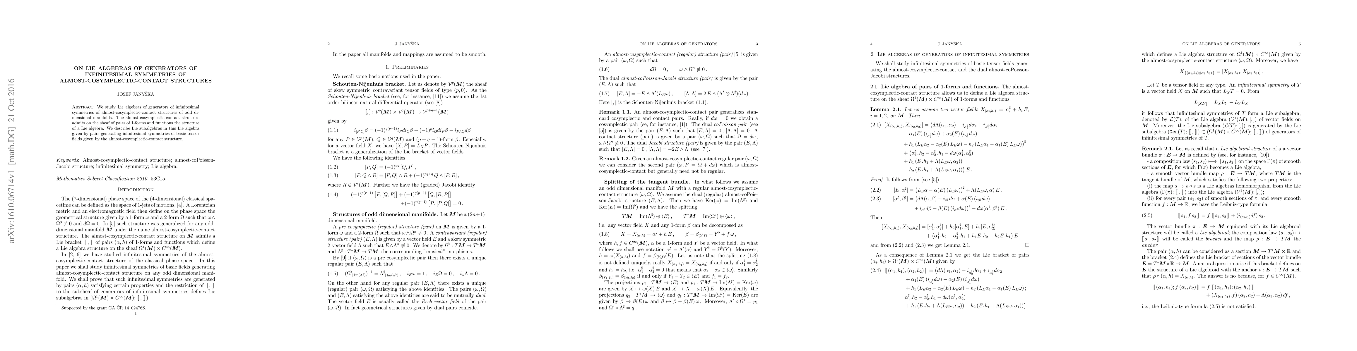 We study Lie algebras of generators of infinitesimal symmetries of almost-cosymplectic-contact structures of odd dimensional manifolds. The almost-cosymplectic-contact structure admits on the sheaf of pairs of 1-forms and functions the structure of a Lie algebra. We describe Lie subalgebras in this Lie algebra given by pairs generating infinitesimal symmetries of basic tensor fields given by the almost-cosymplectic-contact structure.
