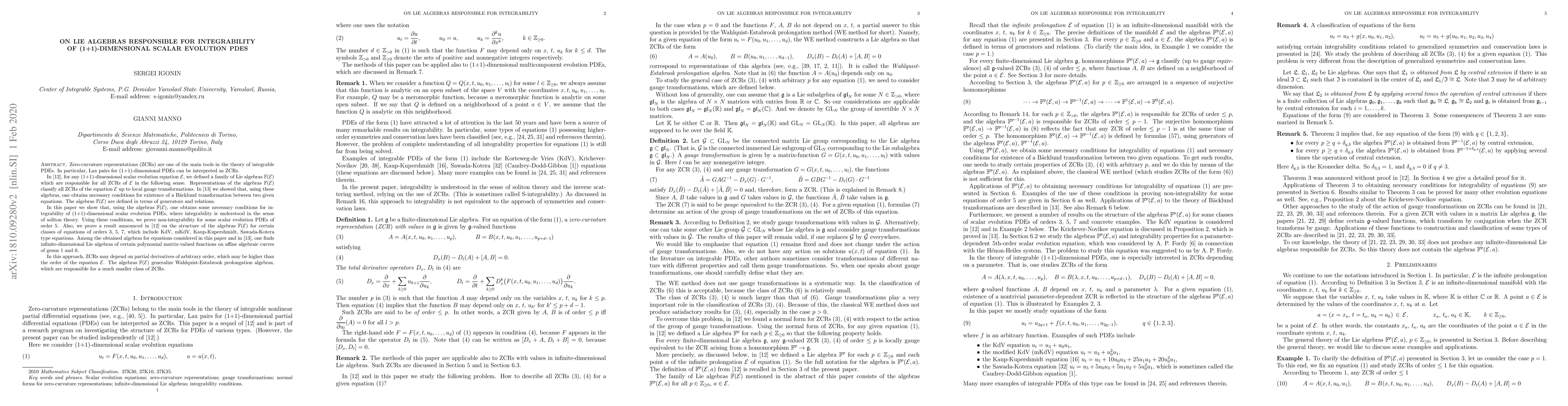 This paper explores the Lie algebras $F(E)$ that classify zero-curvature representations for (1+1)-dimensional scalar evolution PDEs, providing necessary conditions for their integrability in soliton theory. It proves non-integrability for certain order-5 PDEs and details the structure of $F(E)$ for specific classes of equations, including KdV and mKdV.