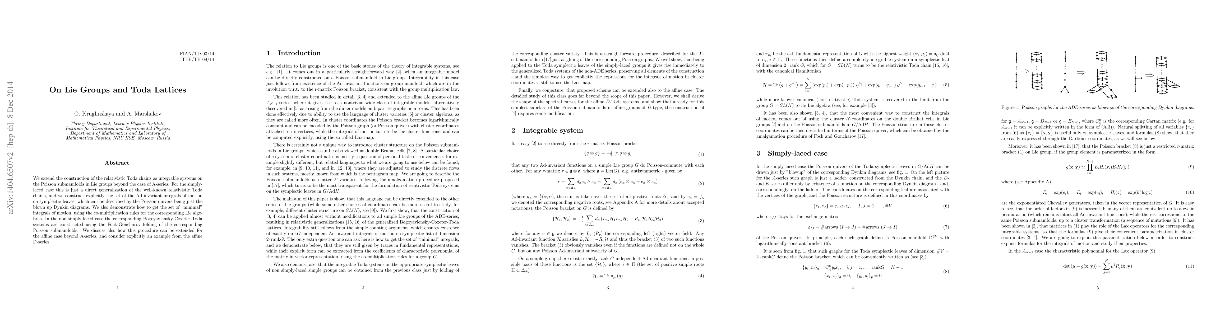 We extend the construction of the relativistic Toda chains as integrable systems on the Poisson submanifolds in Lie groups beyond the case of A-series. For the simply-laced case this is just a direct generalization of the well-known relativistic Toda chains, and we construct explicitly the set of the Ad-invariant integrals of motion on symplectic leaves, which can be described by the Poisson quivers being just the blown up Dynkin diagrams. We also demonstrate how to get the set of "minimal" integrals of motion, using the co-multiplication rules for the corresponding Lie algebras. In the non simply-laced case the corresponding Bogoyavlensky-Coxeter-Toda systems are constructed using the Fock-Goncharov folding of the corresponding Poisson submanifolds. We discuss also how this procedure can be extended for the affine case beyond A-series, and consider explicitly an example from the affine D-series.