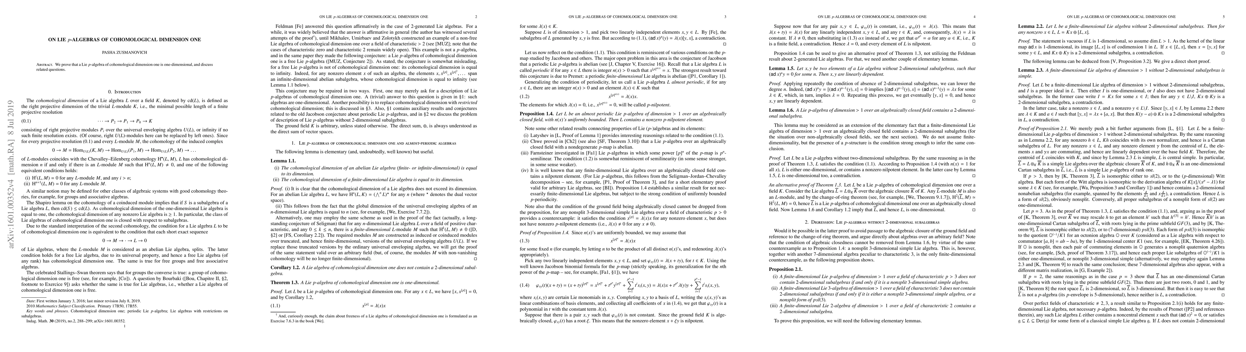 We prove that a Lie $p$-algebra of cohomological dimension one is one-dimensional, and discuss related questions.