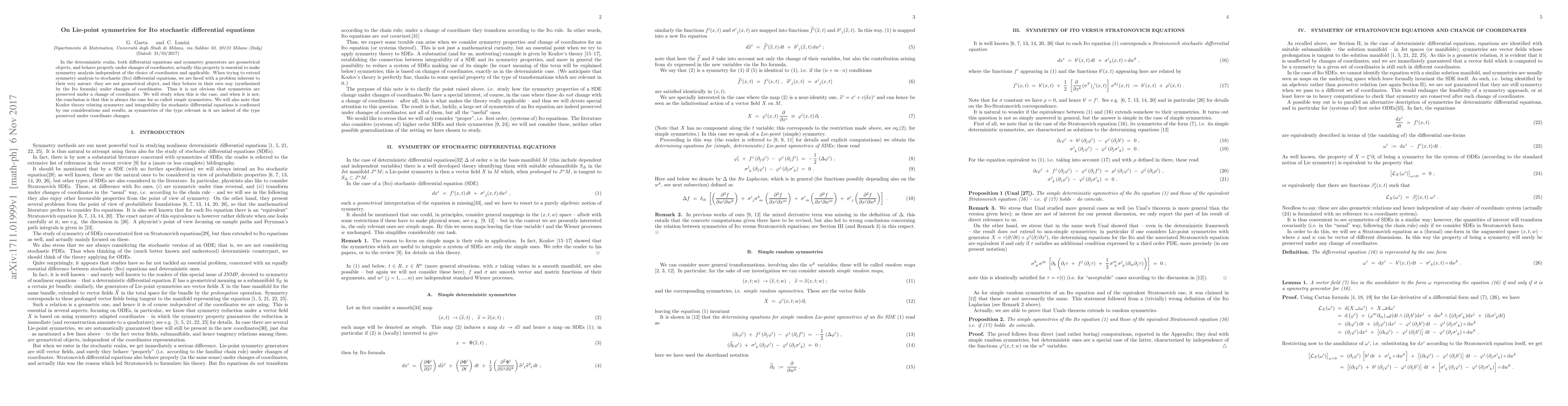 This paper investigates the preservation of Lie-point symmetries in Ito stochastic differential equations under coordinate transformations. It concludes that "simple" symmetries are preserved, confirming Kozlov's theory linking symmetry and integrability in stochastic systems.