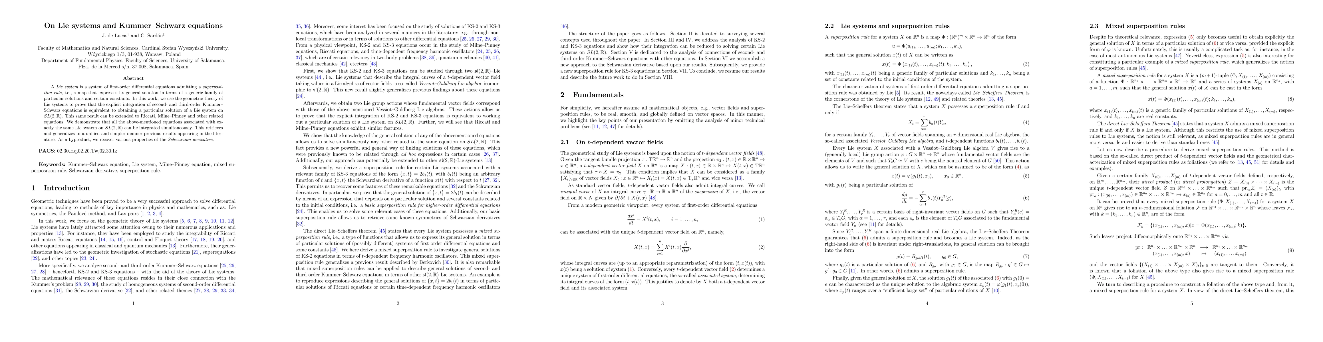 A Lie system is a system of first-order differential equations admitting a superposition rule, i.e., a map that expresses its general solution in terms of a generic family of particular solutions and certain constants. In this work, we use the geometric theory of Lie systems to prove that the explicit integration of second- and third-order Kummer--Schwarz equations is equivalent to obtaining a particular solution of a Lie system on SL(2,R). This same result can be extended to Riccati, Milne--Pinney and other related equations. We demonstrate that all the above-mentioned equations associated with exactly the same Lie system on SL(2,R) can be integrated simultaneously. This retrieves and generalizes in a unified and simpler manner previous results appearing in the literature. As a byproduct, we recover various properties of the Schwarzian derivative.