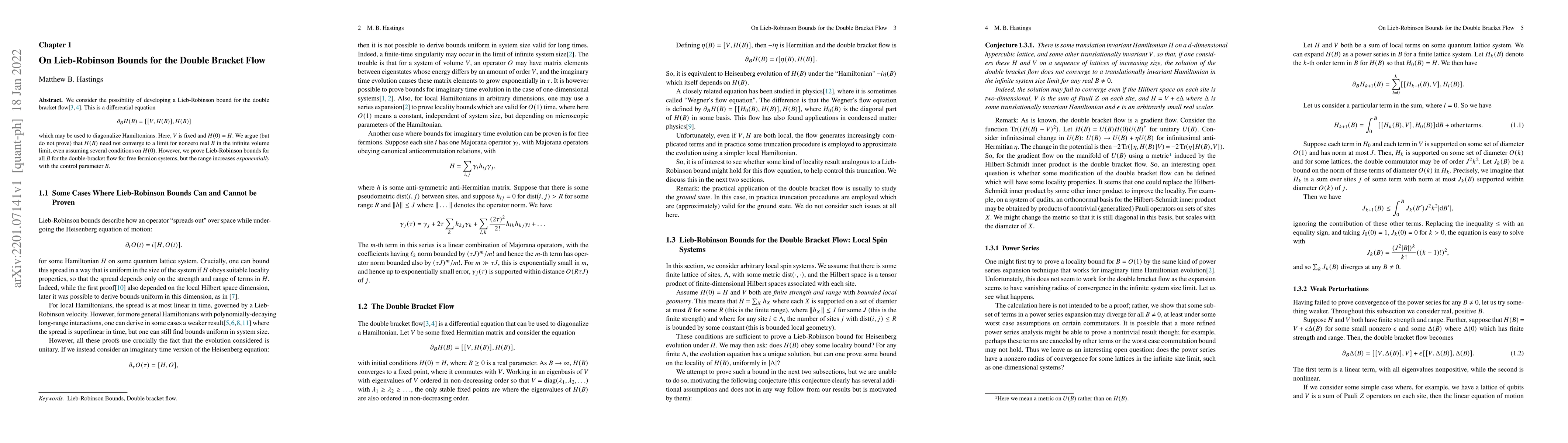 The paper investigates Lieb-Robinson bounds for a double bracket flow used to diagonalize Hamiltonians, focusing on free fermion systems where bounds are proven but with an exponentially increasing range of control parameter B.