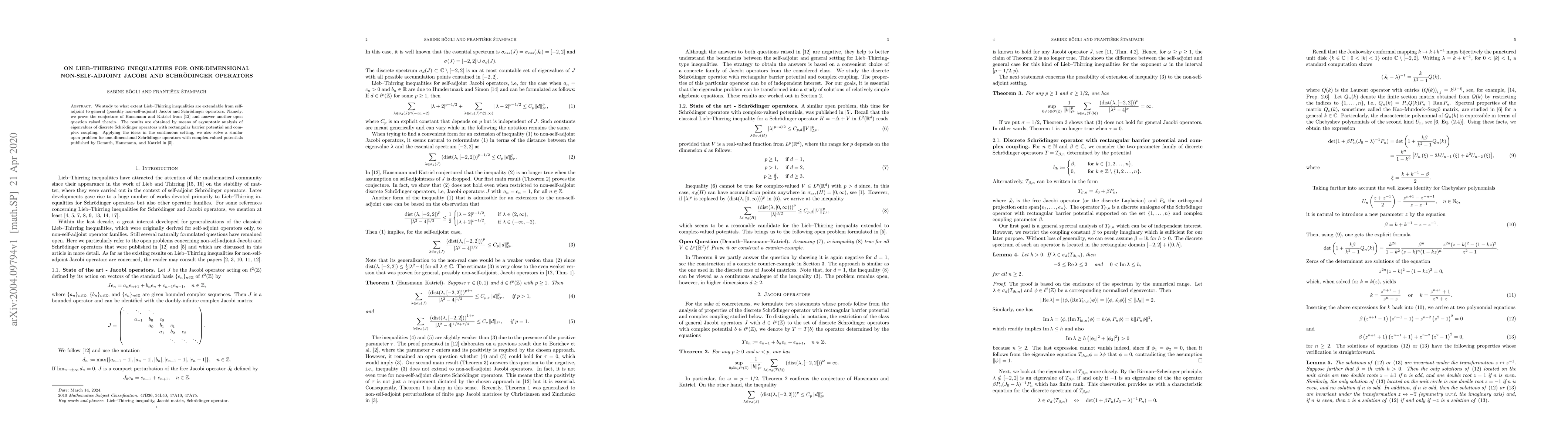 We study to what extent Lieb--Thirring inequalities are extendable from self-adjoint to general (possibly non-self-adjoint) Jacobi and Schr\"{o}dinger operators. Namely, we prove the conjecture of Hansmann and Katriel from [Complex Anal. Oper. Theory 5, No. 1 (2011), 197-218] and answer another open question raised therein. The results are obtained by means of asymptotic analysis of eigenvalues of discrete Schr\"{o}dinger operators with rectangular barrier potential and complex coupling. Applying the ideas in the continuous setting, we also solve a similar open problem for one-dimensional Schr\"{o}dinger operators with complex-valued potentials published by Demuth, Hansmann, and Katriel in [Integral Equations Operator Theory 75, No. 1 (2013), 1-5].