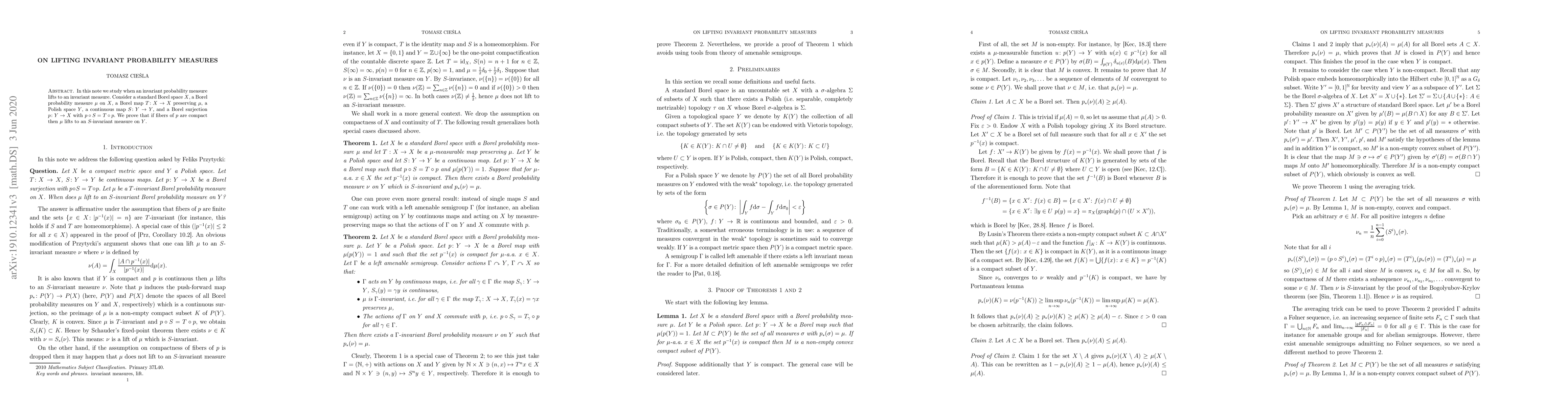 This paper investigates conditions under which an invariant probability measure on a Borel space $X$ can be lifted to an invariant measure on a compact metric space $Y$, given a Borel map $T$ and a continuous map $S$ with a surjective Borel map $p$ satisfying $p \circ S = T \circ p$. The authors prove that if the fibers of $p$ are compact, then the invariant measure on $X$ lifts to an $S$-invariant measure on $Y$.