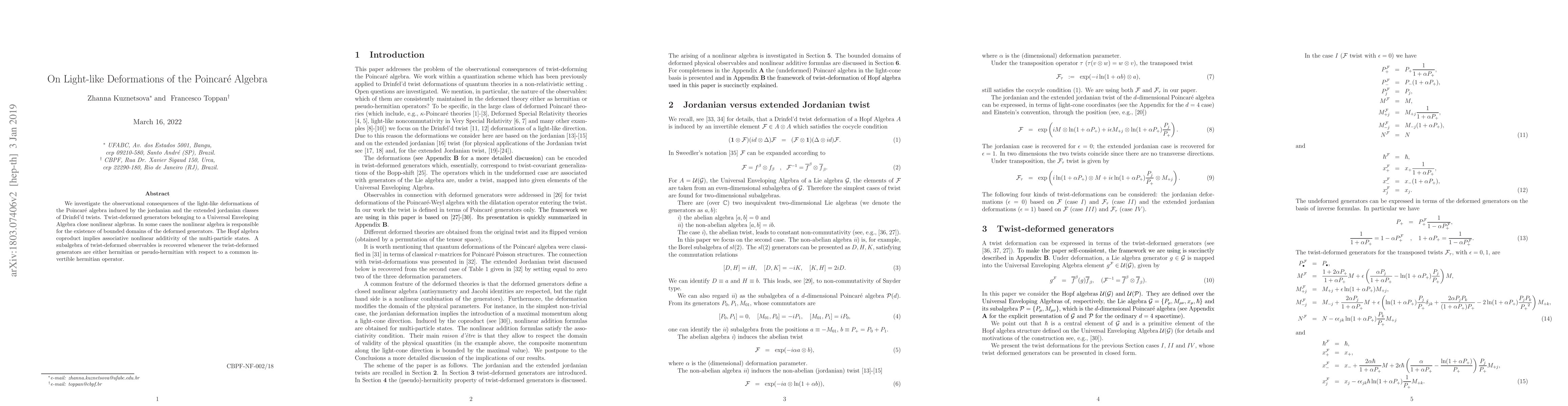 We investigate the observational consequences of the light-like deformations of the Poincar\'e algebra induced by the jordanian and the extended jordanian classes of Drinfel'd twists. Twist-deformed generators belonging to a Universal Enveloping Algebra close nonlinear algebras. In some cases the nonlinear algebra is responsible for the existence of bounded domains of the deformed generators. The Hopf algebra coproduct implies associative nonlinear additivity of the multi-particle states. A subalgebra of twist-deformed observables is recovered whenever the twist-deformed generators are either hermitian or pseudo-hermitian with respect to a common invertible hermitian operator.