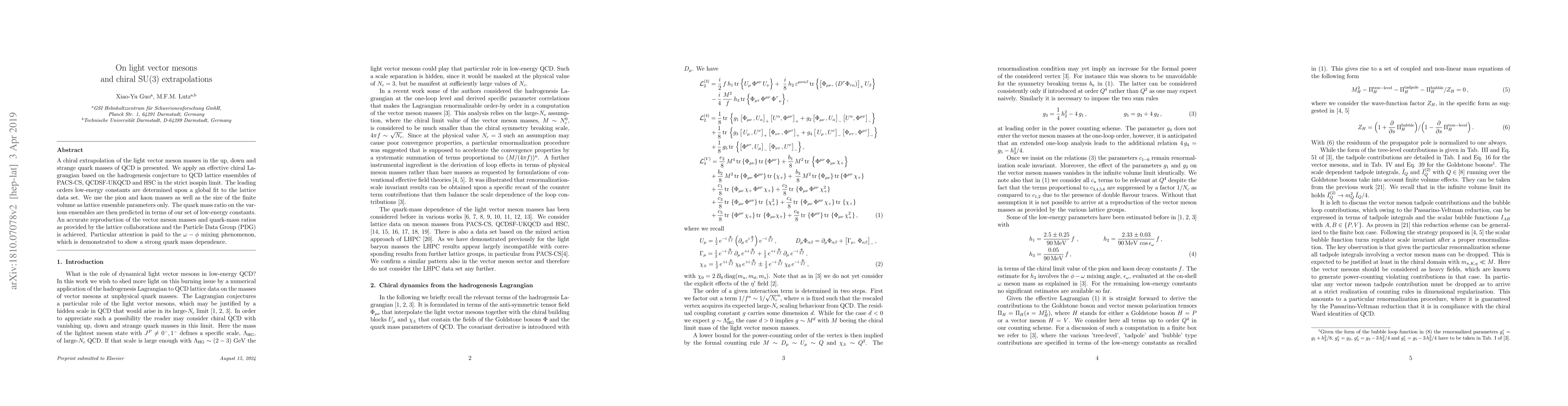 This research uses an effective chiral Lagrangian to extrapolate light vector meson masses in QCD, achieving accurate reproduction of meson masses and quark-mass ratios. It highlights strong quark mass dependence in u03c9-u03c4 mixing, employing lattice ensembles from PACS-CS, QCDSF-UKQCD, and HSC in the isospin limit.