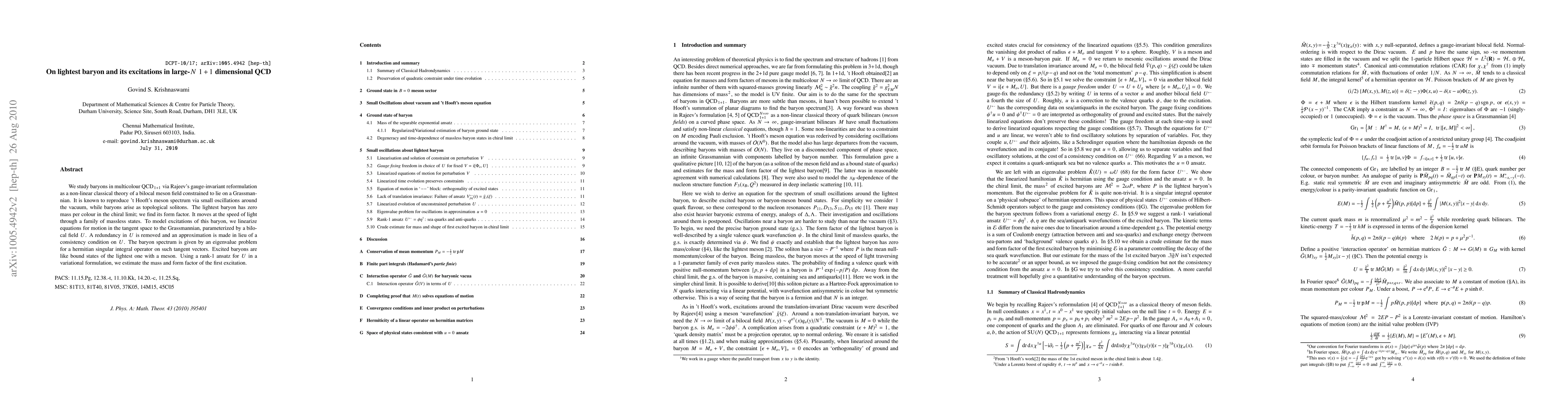 We study baryons in multicolour 1+1D QCD via Rajeev's gauge-invariant reformulation as a non-linear classical theory of a bilocal meson field constrained to lie on a Grassmannian. It is known to reproduce 't Hooft's meson spectrum via small oscillations around the vacuum, while baryons arise as topological solitons. The lightest baryon has zero mass per colour in the chiral limit; we find its form factor. It moves at the speed of light through a family of massless states. To model excitations of this baryon, we linearize equations for motion in the tangent space to the Grassmannian, parameterized by a bilocal field U. A redundancy in U is removed and an approximation is made in lieu of a consistency condition on U. The baryon spectrum is given by an eigenvalue problem for a hermitian singular integral operator on such tangent vectors. Excited baryons are like bound states of the lightest one with a meson. Using a rank-1 ansatz for U in a variational formulation, we estimate the mass and form factor of the first excitation.