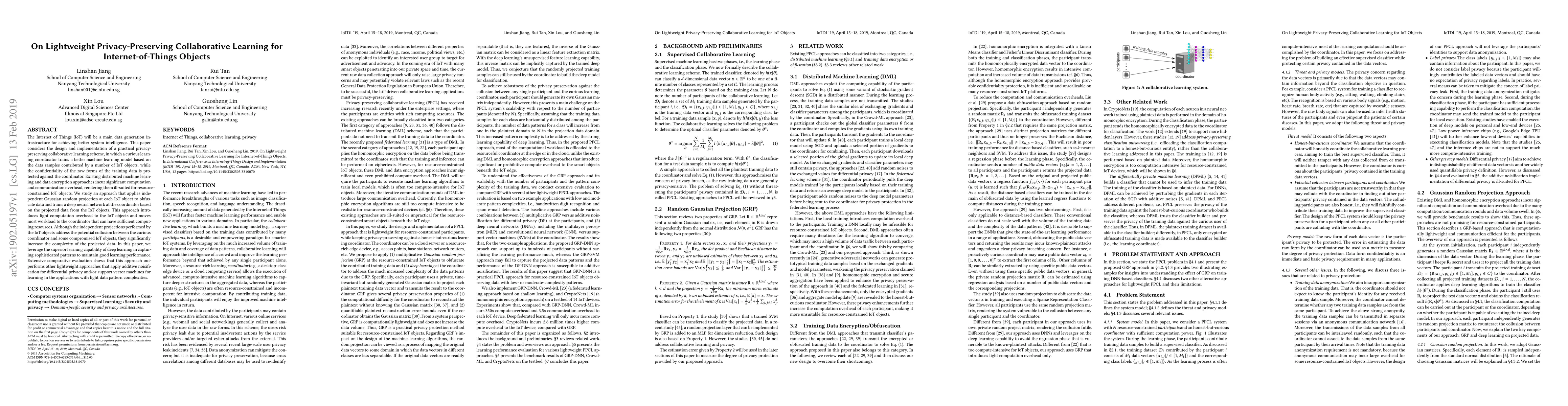 This paper proposes a lightweight privacy-preserving collaborative learning scheme for IoT objects, utilizing Gaussian random projection to obfuscate data and deep neural networks to maintain learning performance, while minimizing computational overhead on resource-constrained IoT devices. The approach outperforms other lightweight methods in scenarios with moderate data complexity.