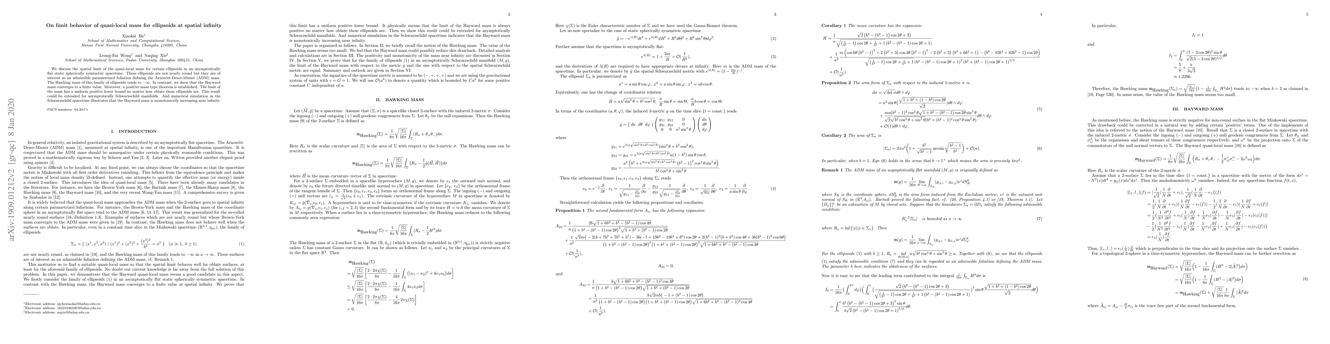 We discuss the spatial limit of the quasi-local mass for certain ellipsoids in an asymptotically flat static spherically symmetric spacetime. These ellipsoids are not nearly round but they are of interest as an admissible parametrized foliation defining the Arnowitt-Deser-Misner (ADM) mass. The Hawking mass of this family of ellipsoids tends to $-\infty$. In contrast, we show that the Hayward mass converges to a finite value. Moreover, a positive mass type theorem is established. The limit of the mass has a uniform positive lower bound no matter how oblate these ellipsoids are. This result could be extended for asymptotically Schwarzschild manifolds. And numerical simulation in the Schwarzschild spacetime illustrates that the Hayward mass is monotonically increasing near infinity.