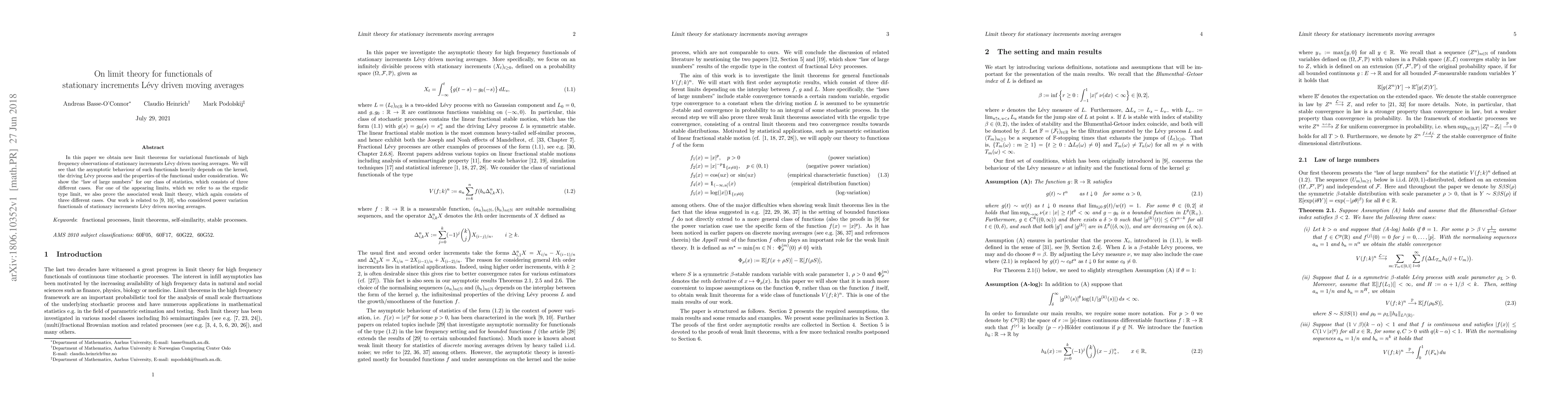This paper establishes new limit theorems for variational functionals of high-frequency observations of stationary increments Lévy-driven moving averages, demonstrating that the asymptotic behavior depends on the kernel, driving Lévy process, and functional properties. It proves the "law of large numbers" and weak limit theory for three distinct cases, extending related work on power variation functionals.