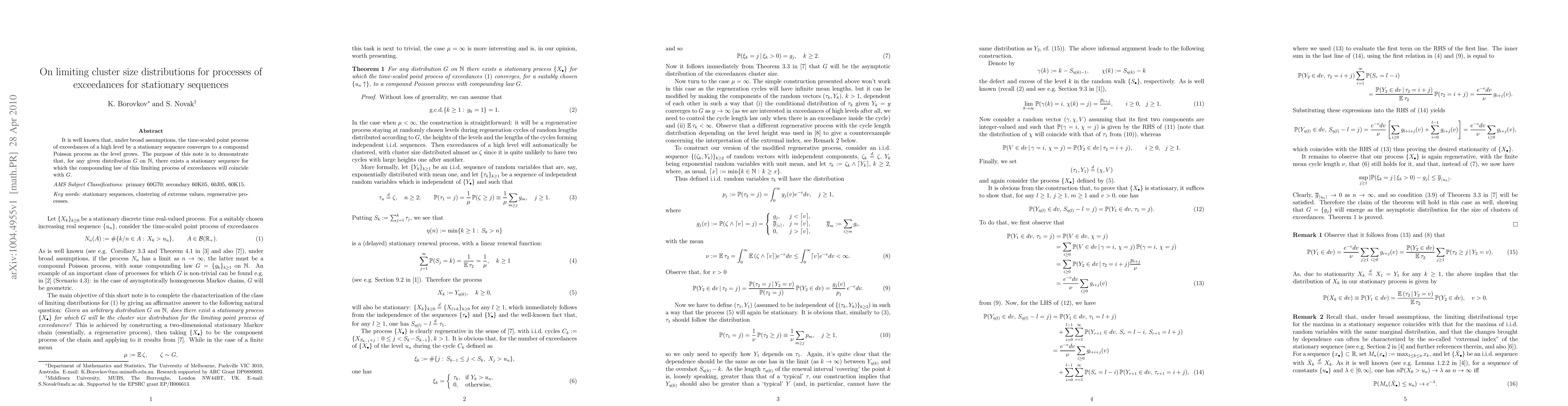 This paper investigates the limiting behavior of exceedance processes in stationary sequences, showing that for any given distribution G on natural numbers, there exists a sequence where the limiting process of exceedances follows a compound Poisson process with compounding law G.