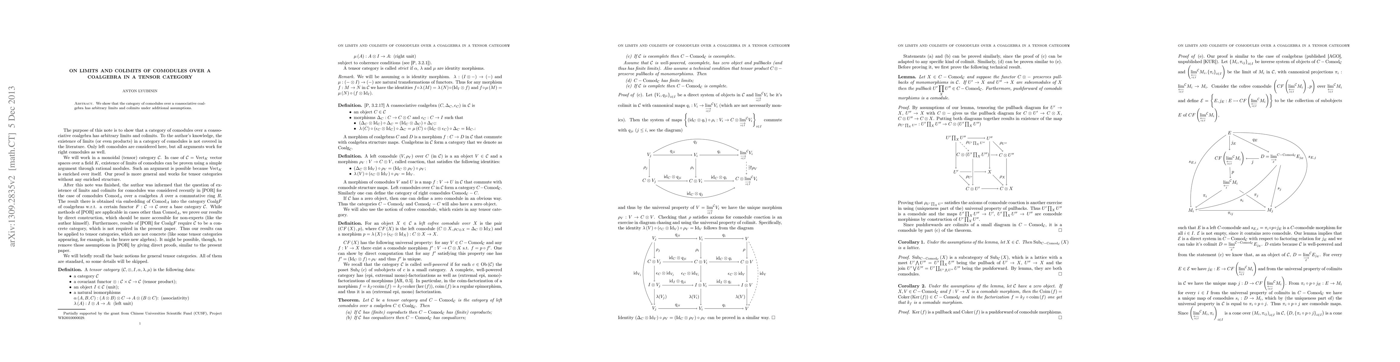 Summary: This paper demonstrates that the category of comodules over a coassociative coalgebra within a complete, cocomplete, and well-powered tensor category possesses both limits and colimits, provided certain additional conditions are met. The study highlights the structural properties that enable these constructions.