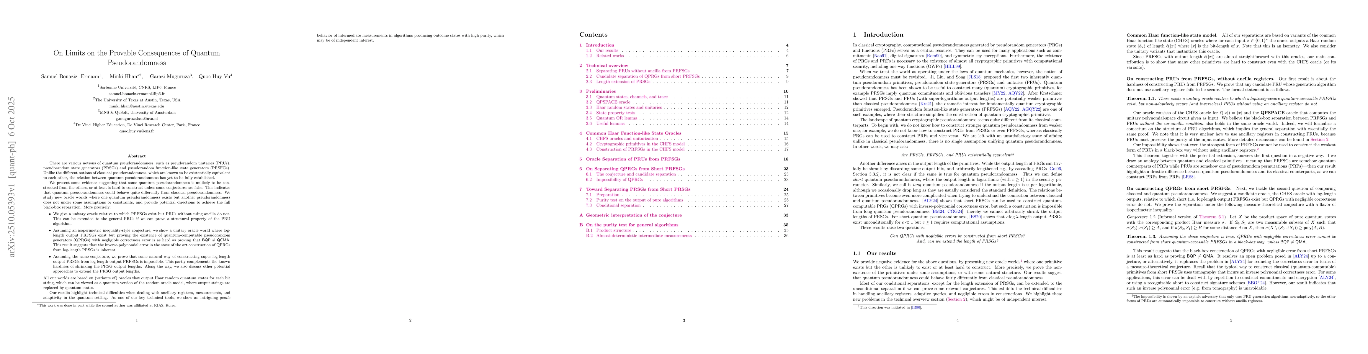 The work presents the first formal separation between quantum and classical pseudorandom generators under specific oracle models, combined with new computational techniques for cryptographic analysis.