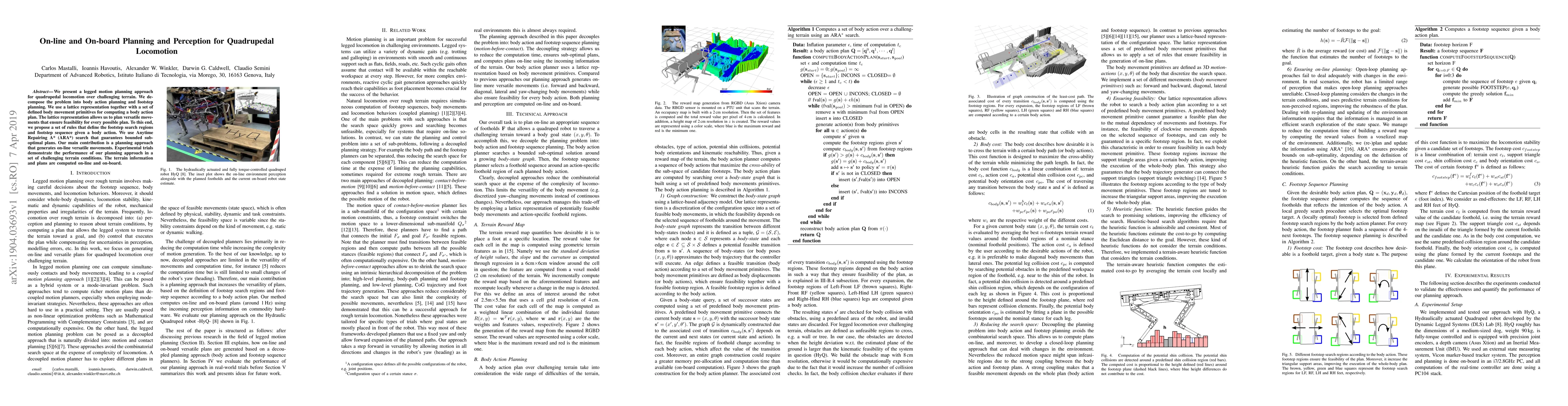 This paper presents a method for quadrupedal locomotion planning that integrates on-line and on-board perception and movement strategies, using a lattice representation and Anytime Repairing A* search to generate feasible, versatile movements over challenging terrain. Experimental results show effective performance in dynamic environments.