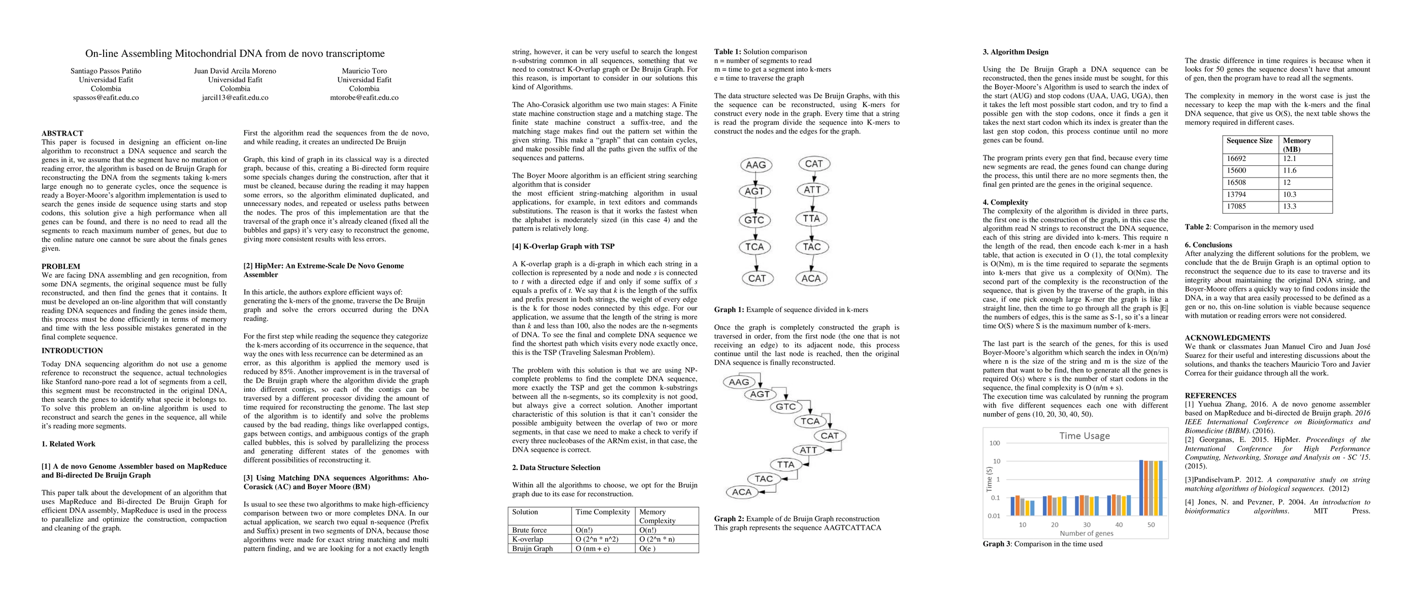 This paper proposes an efficient online algorithm for reconstructing mitochondrial DNA from de novo transcriptome data using a de Bruijn graph and Boyer-Moore's algorithm for gene search, achieving high performance but with uncertainty in final gene identification due to its online nature.