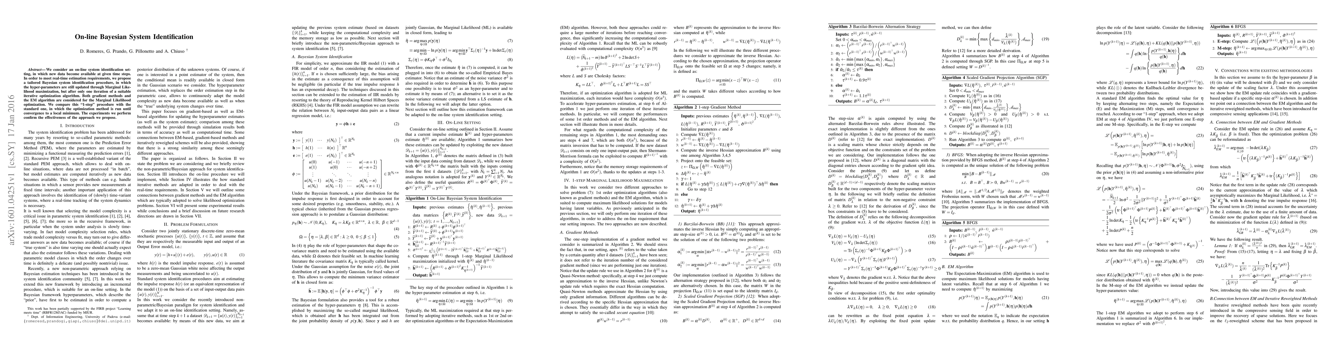 This paper proposes an on-line Bayesian system identification method that updates hyper-parameters via a single iteration of optimization, contrasting with the standard full convergence approach. Experiments show the effectiveness of the "1-step" procedure for real-time estimation.