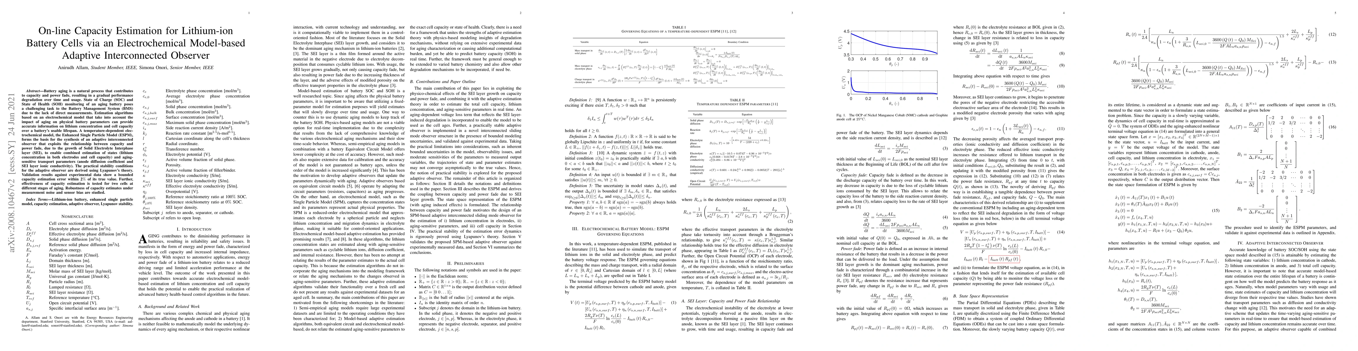 This paper proposes an adaptive interconnected observer using an Enhanced Single Particle Model (ESPM) to estimate the capacity of lithium-ion battery cells online, accounting for aging effects. The observer demonstrates practical stability and achieves a capacity estimation error within 2% of the true value, validated through experimental data.
