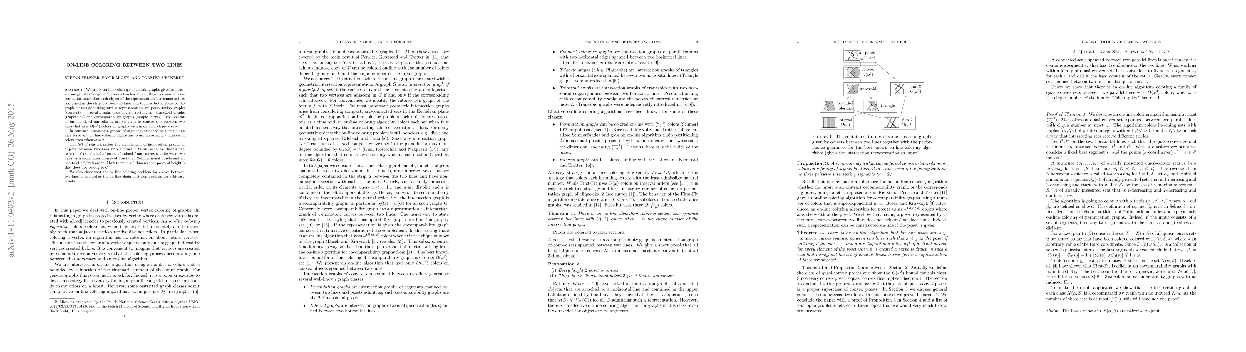 We study on-line colorings of certain graphs given as intersection graphs of objects "between two lines", i.e., there is a pair of horizontal lines such that each object of the representation is a connected set contained in the strip between the lines and touches both. Some of the graph classes admitting such a representation are permutation graphs (segments), interval graphs (axis-aligned rectangles), trapezoid graphs (trapezoids) and cocomparability graphs (simple curves). We present an on-line algorithm coloring graphs given by convex sets between two lines that uses $O(\omega^3)$ colors on graphs with maximum clique size $\omega$. In contrast intersection graphs of segments attached to a single line may force any on-line coloring algorithm to use an arbitrary number of colors even when $\omega=2$. The {\em left-of} relation makes the complement of intersection graphs of objects between two lines into a poset. As an aside we discuss the relation of the class $\mathcal{C}$ of posets obtained from convex sets between two lines with some other classes of posets: all $2$-dimensional posets and all posets of height $2$ are in $\mathcal{C}$ but there is a $3$-dimensional poset of height $3$ that does not belong to $\mathcal{C}$. We also show that the on-line coloring problem for curves between two lines is as hard as the on-line chain partition problem for arbitrary posets.
