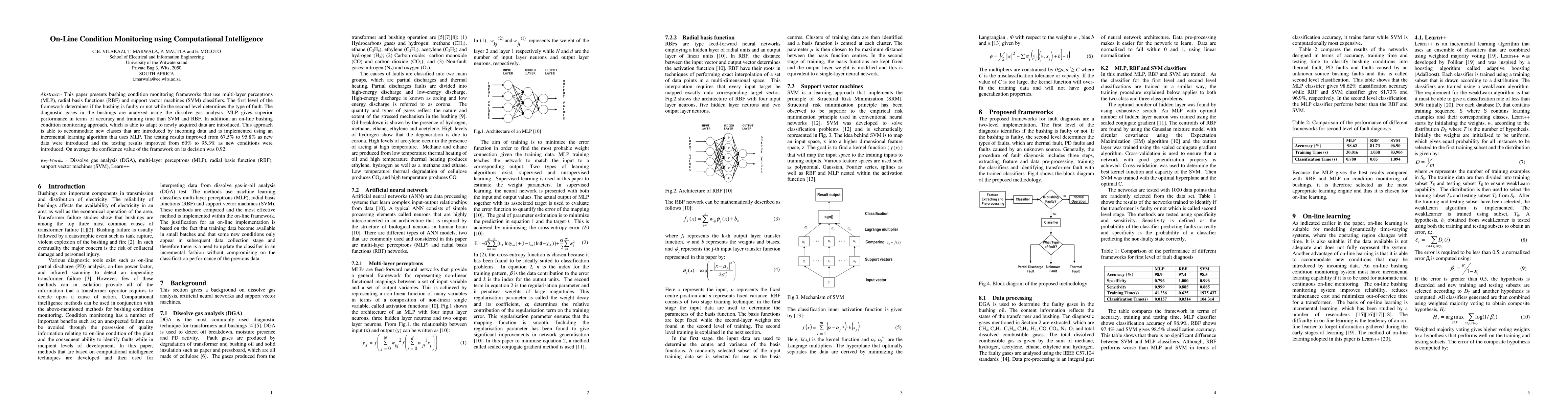 This paper develops a computational intelligence-based framework for on-line bushing condition monitoring using MLP, RBF, and SVM classifiers, with MLP showing superior accuracy and training efficiency. An incremental learning algorithm enhances the system's adaptability to new data, improving testing results significantly.