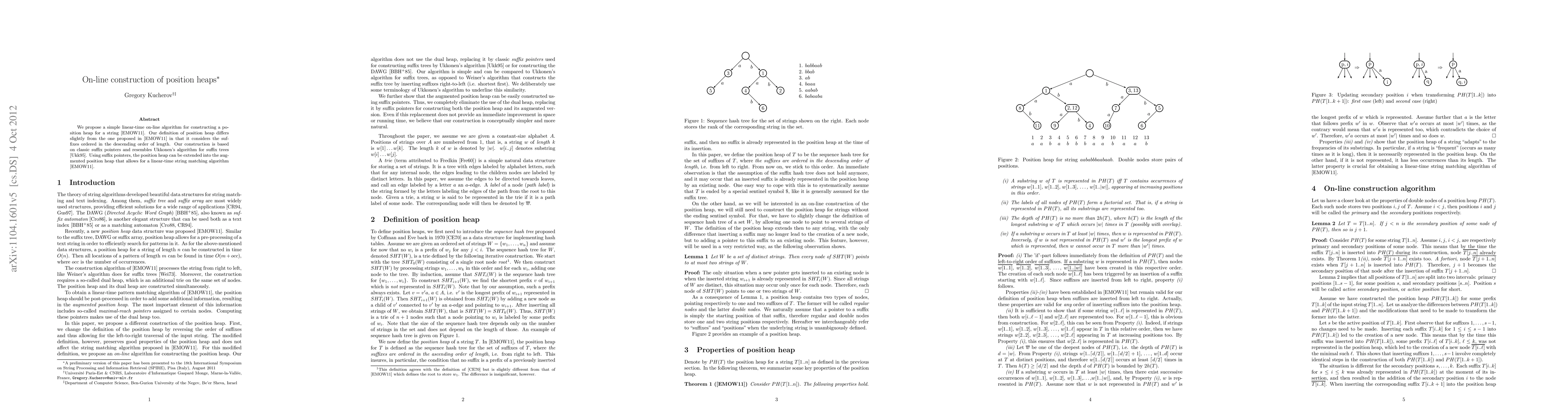 This paper presents a linear-time on-line algorithm for constructing a position heap for a string, differing slightly from previous definitions by ordering suffixes from left to right. The algorithm utilizes suffix pointers, similar to Ukkonen's suffix tree construction, and extends to an augmented position heap for efficient linear-time string matching.