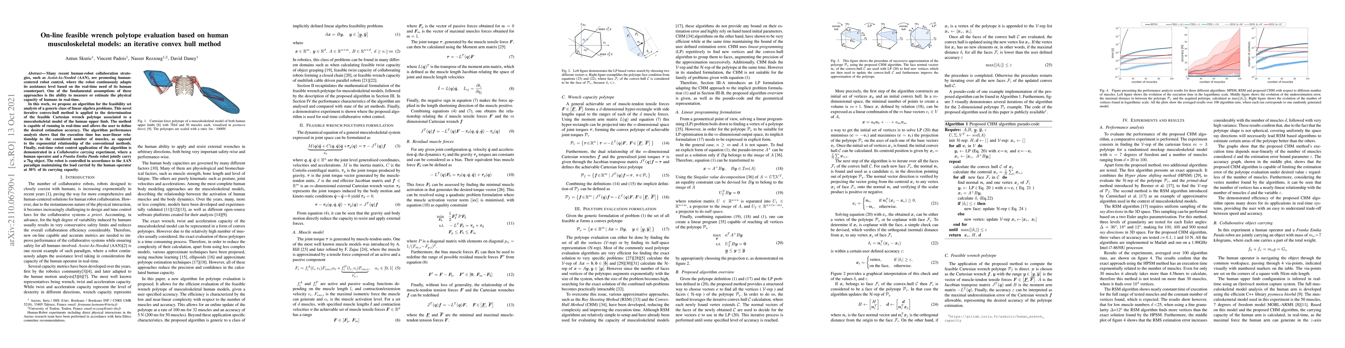 Many recent human-robot collaboration strategies, such as Assist-As-Needed (AAN), are promoting humancentered robot control, where the robot continuously adapts its assistance level based on the real-time need of its human counterpart. One of the fundamental assumptions of these approaches is the ability to measure or estimate the physical capacity of humans in real-time. In this work, we propose an algorithm for the feasibility set analysis of a generic class of linear algebra problems. This novel iterative convex-hull method is applied to the determination of the feasible Cartesian wrench polytope associated to a musculoskeletal model of the human upper limb. The method is capable of running in real-time and allows the user to define the desired estimation accuracy. The algorithm performance analysis shows that the execution time has near-linear relationship to the considered number of muscles, as opposed to the exponential relationship of the conventional methods. Finally, real-time robot control application of the algorithm is demonstrated in a Collaborative carrying experiment, where a human operator and a Franka Emika Panda robot jointly carry a 7kg object. The robot is controlled in accordance to the AAN paradigm maintaining the load carried by the human operator at 30% of its carrying capacity.