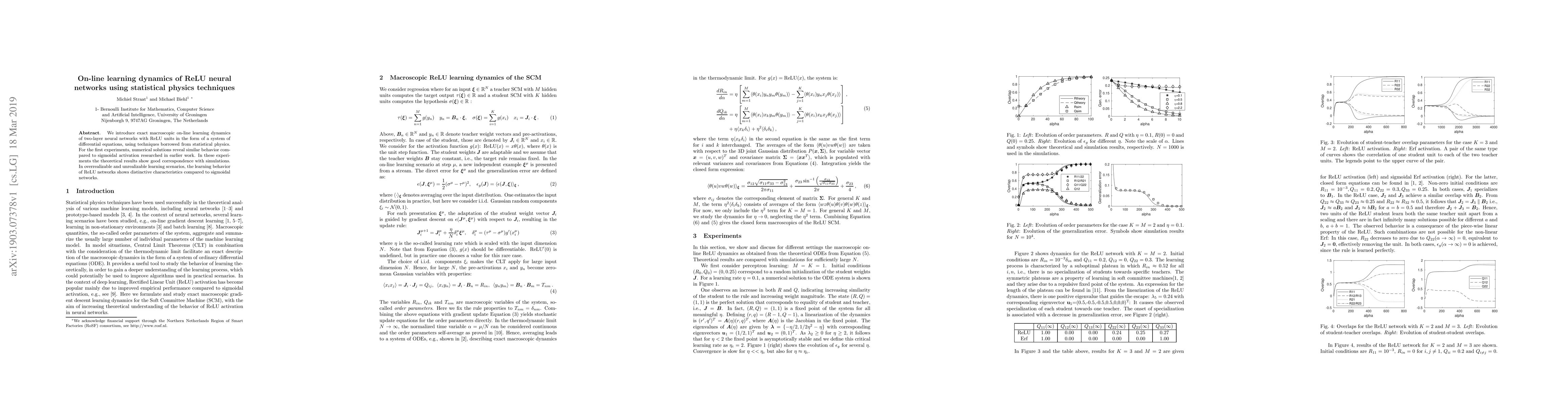 We introduce exact macroscopic on-line learning dynamics of two-layer neural networks with ReLU units in the form of a system of differential equations, using techniques borrowed from statistical physics. For the first experiments, numerical solutions reveal similar behavior compared to sigmoidal activation researched in earlier work. In these experiments the theoretical results show good correspondence with simulations. In ove-rrealizable and unrealizable learning scenarios, the learning behavior of ReLU networks shows distinctive characteristics compared to sigmoidal networks.
