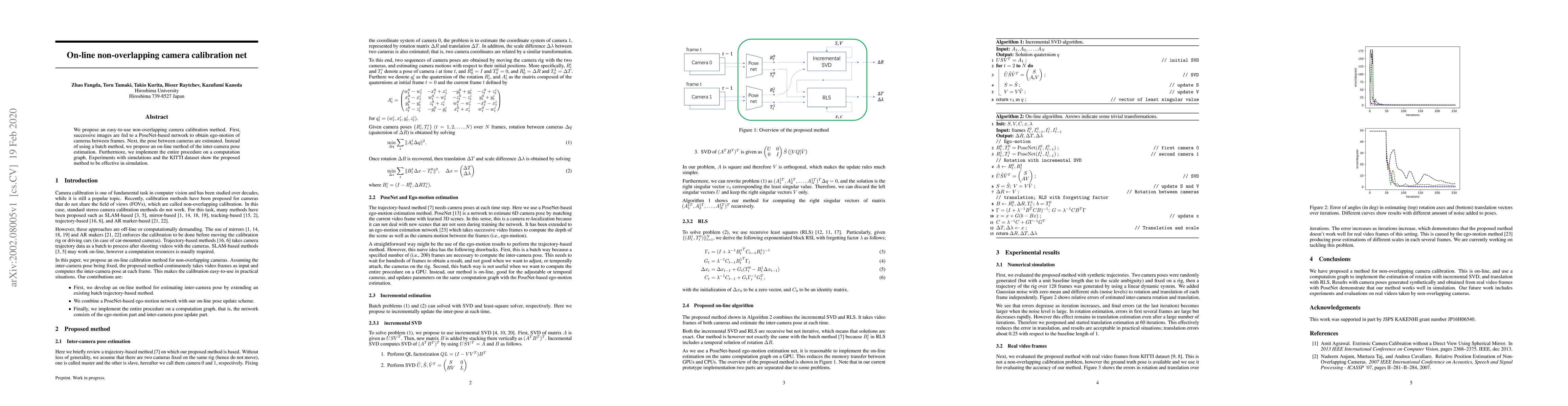 This paper introduces an easy-to-use, on-line non-overlapping camera calibration method that uses a PoseNet-based network to estimate ego-motion between successive images, followed by an on-line inter-camera pose estimation implemented on a computation graph. Experimental results on simulations and the KITTI dataset demonstrate its effectiveness.